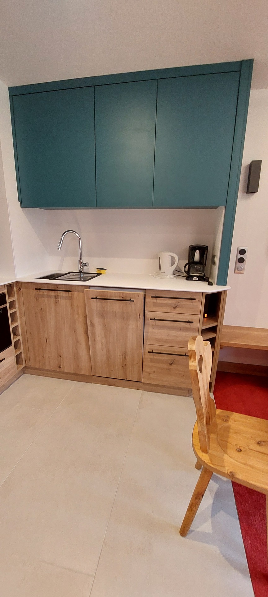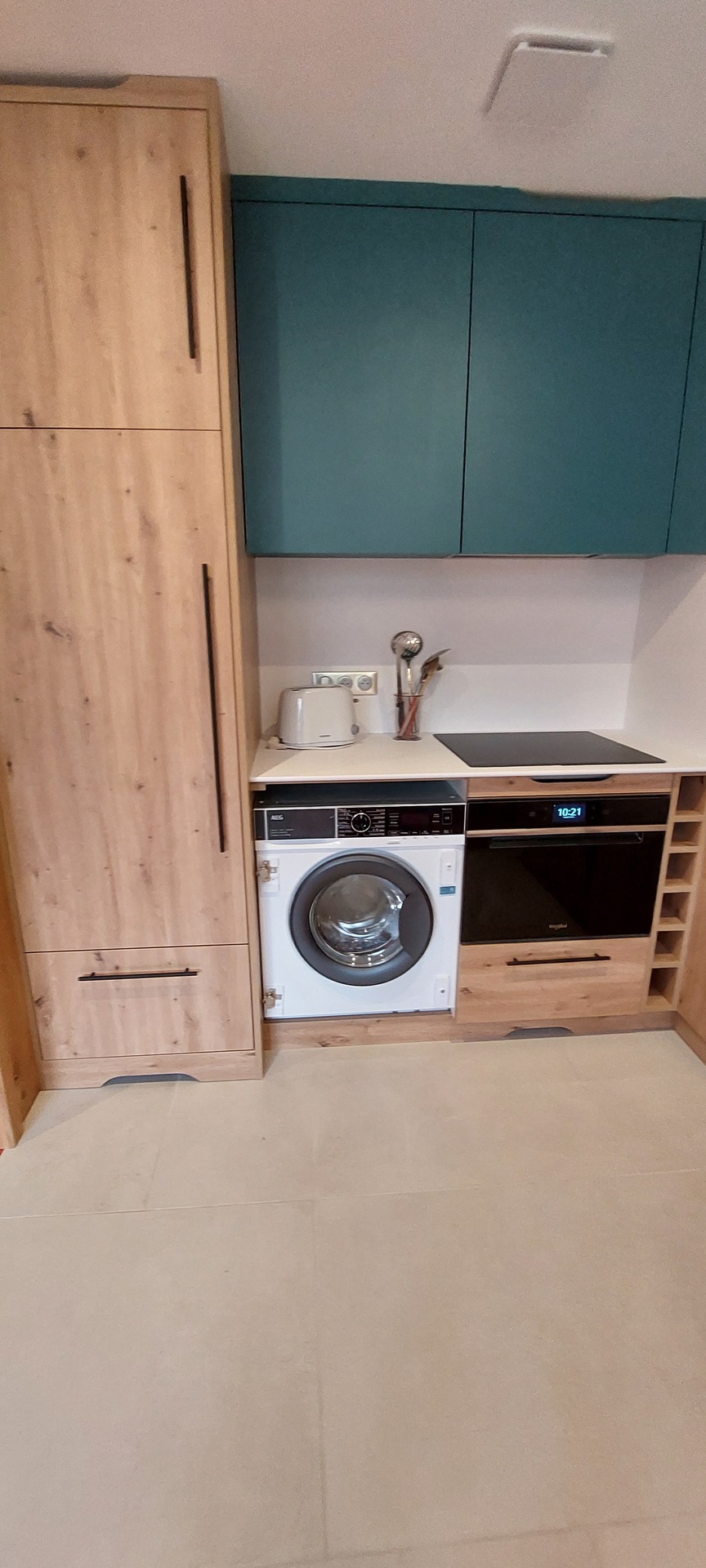 Equipped with microwave with grill, dishwasher, induction hob, fridge with freezer, electric hood, washing machine dryer
