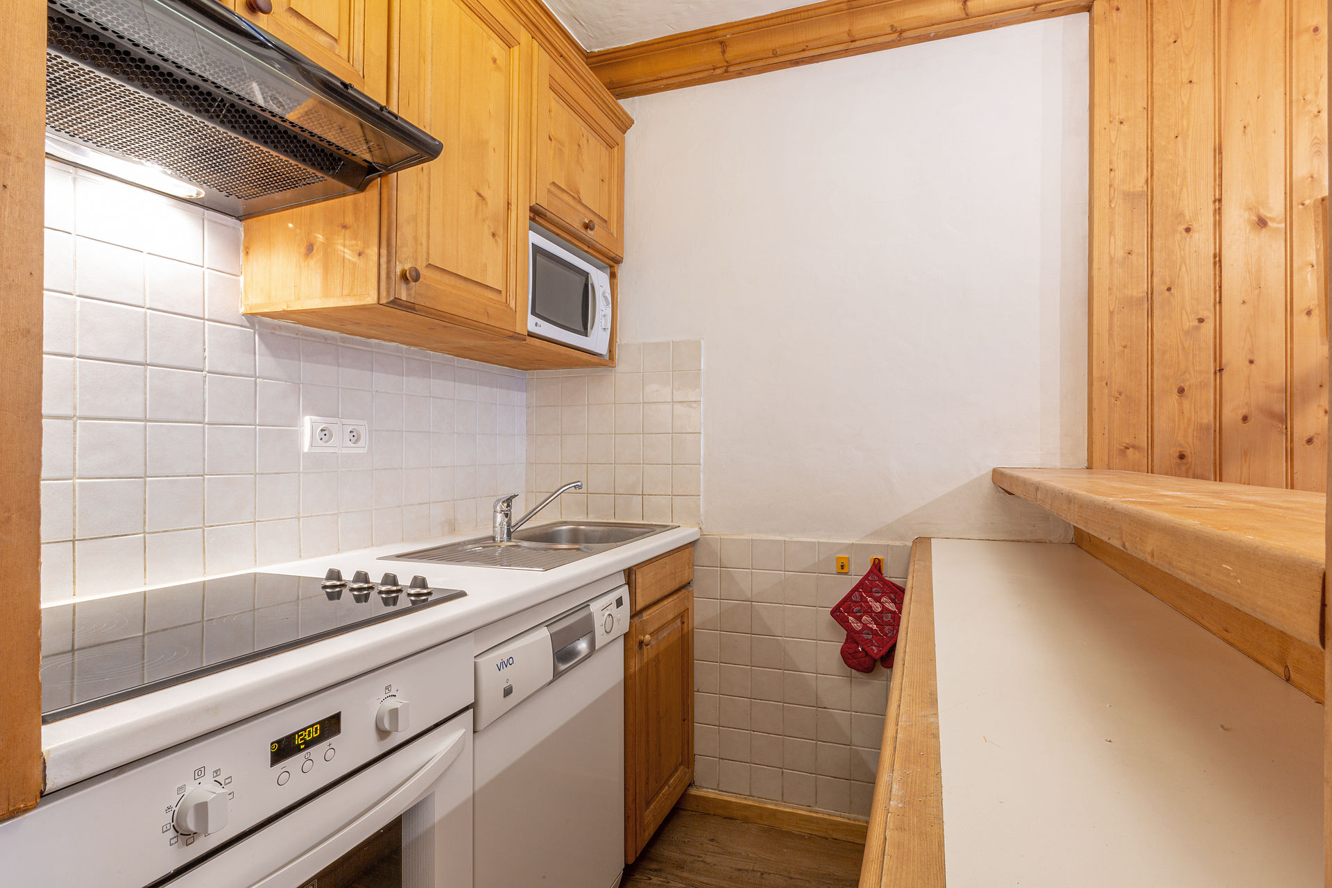 Fully equipped kitchen with microwave oven, dishwasher, ceramic hob, hood, oven, large fridge with freezer.
