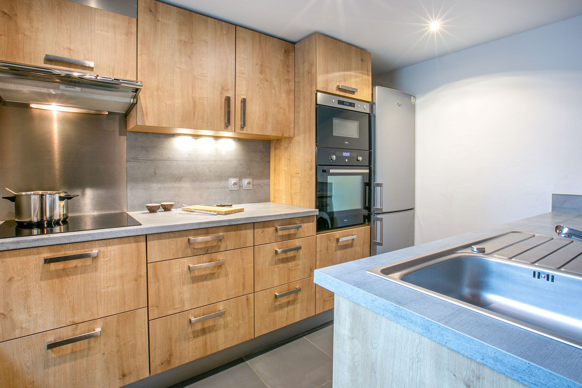 Equipped with dishwasher, oven, induction hob, hood, washing machine, microwave oven, large fridge with freezer