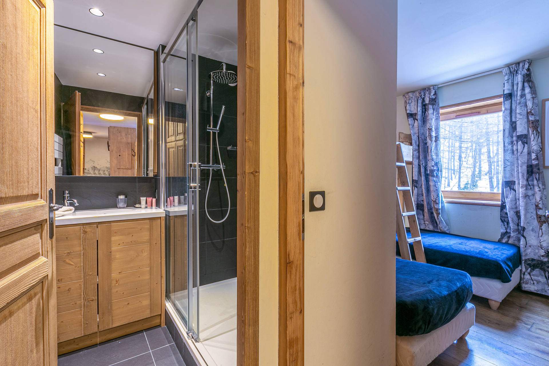 Located on the 1rst floor of the chalet with a large and sunny South/East facing terrace.