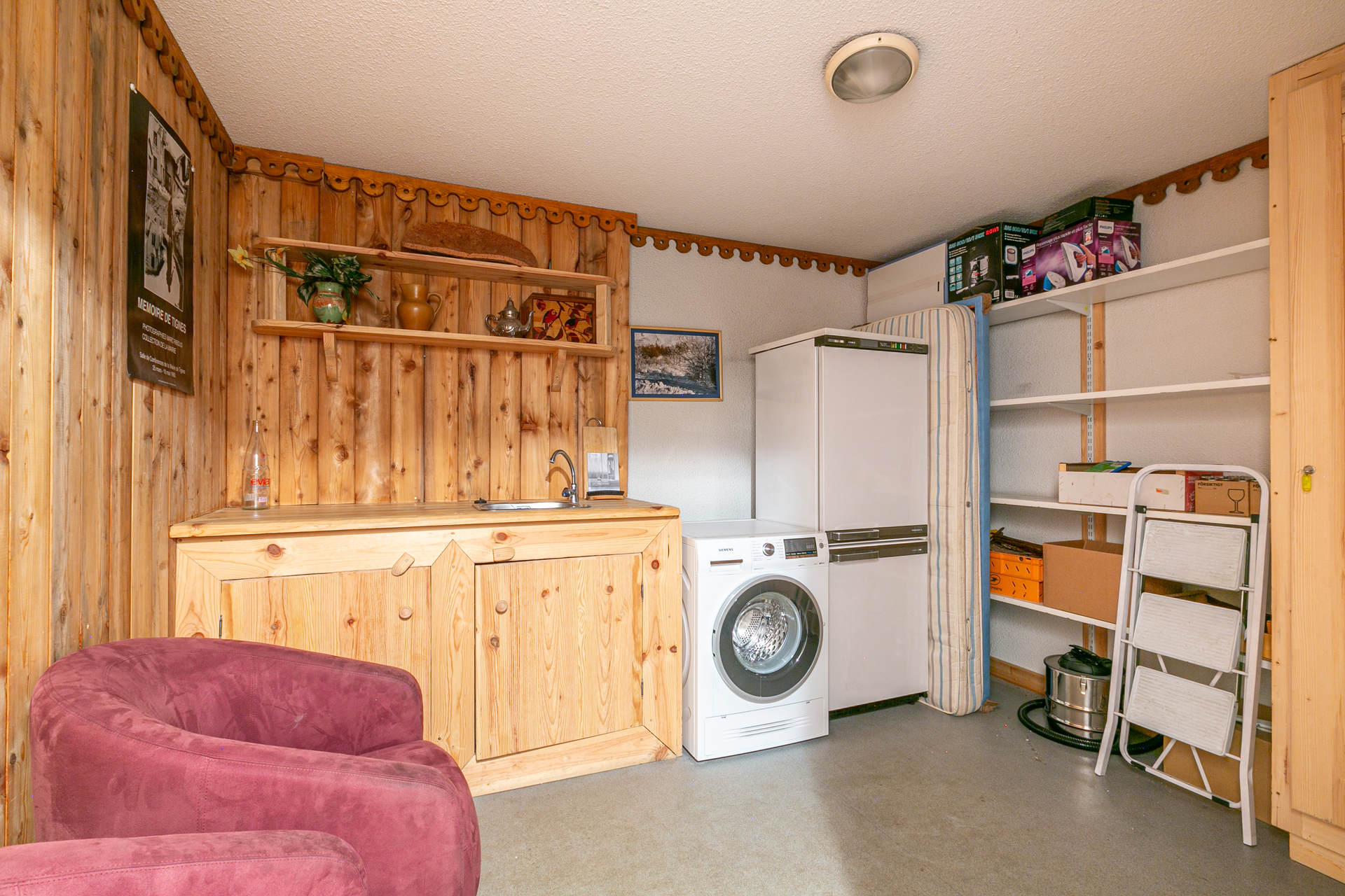 Cave first floor right (level 2): Laundry room with washing machine/tumble dryer and ski storage