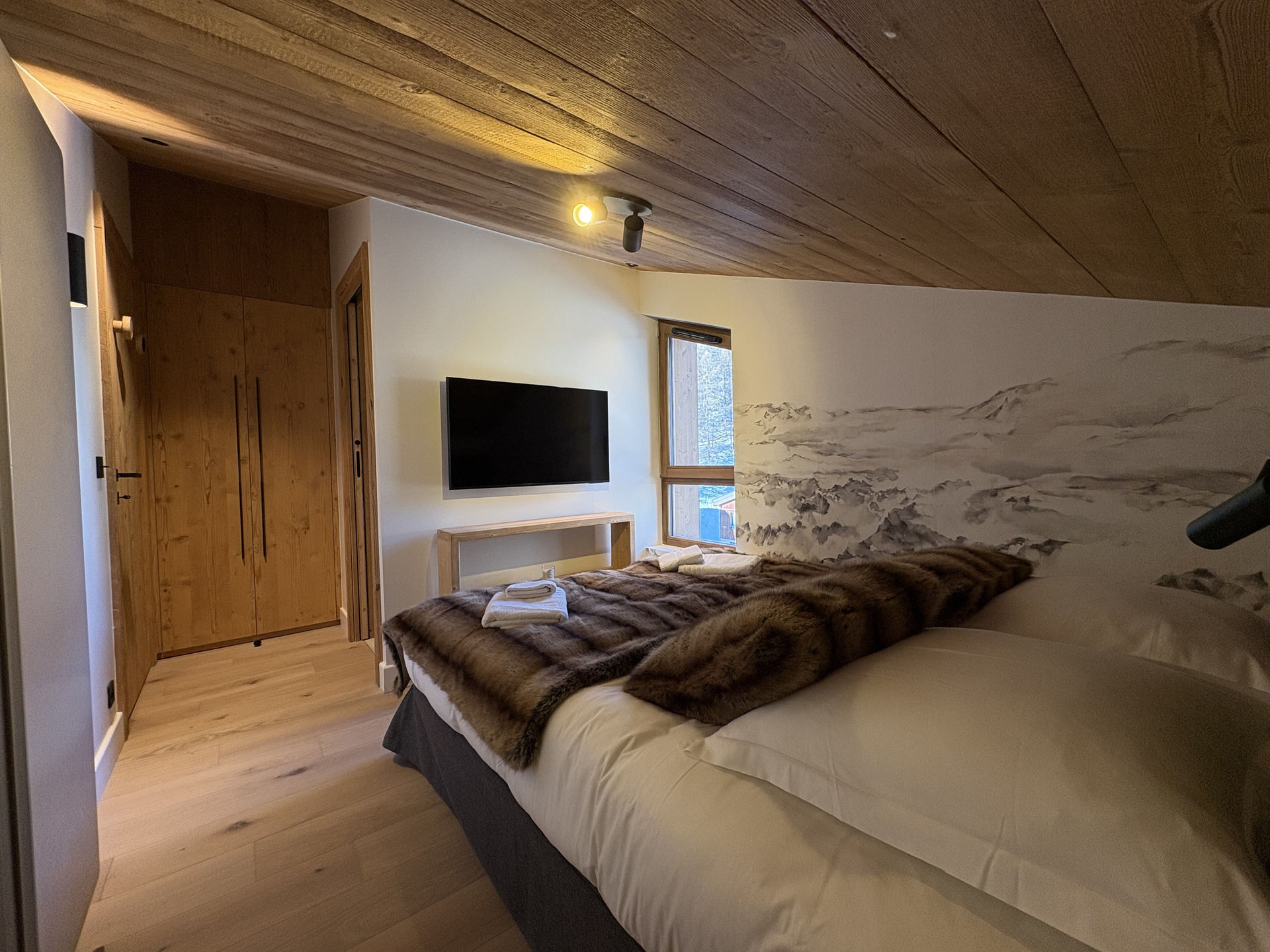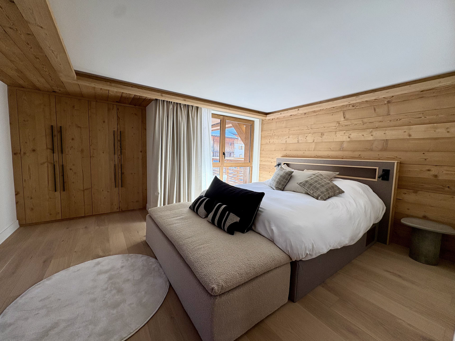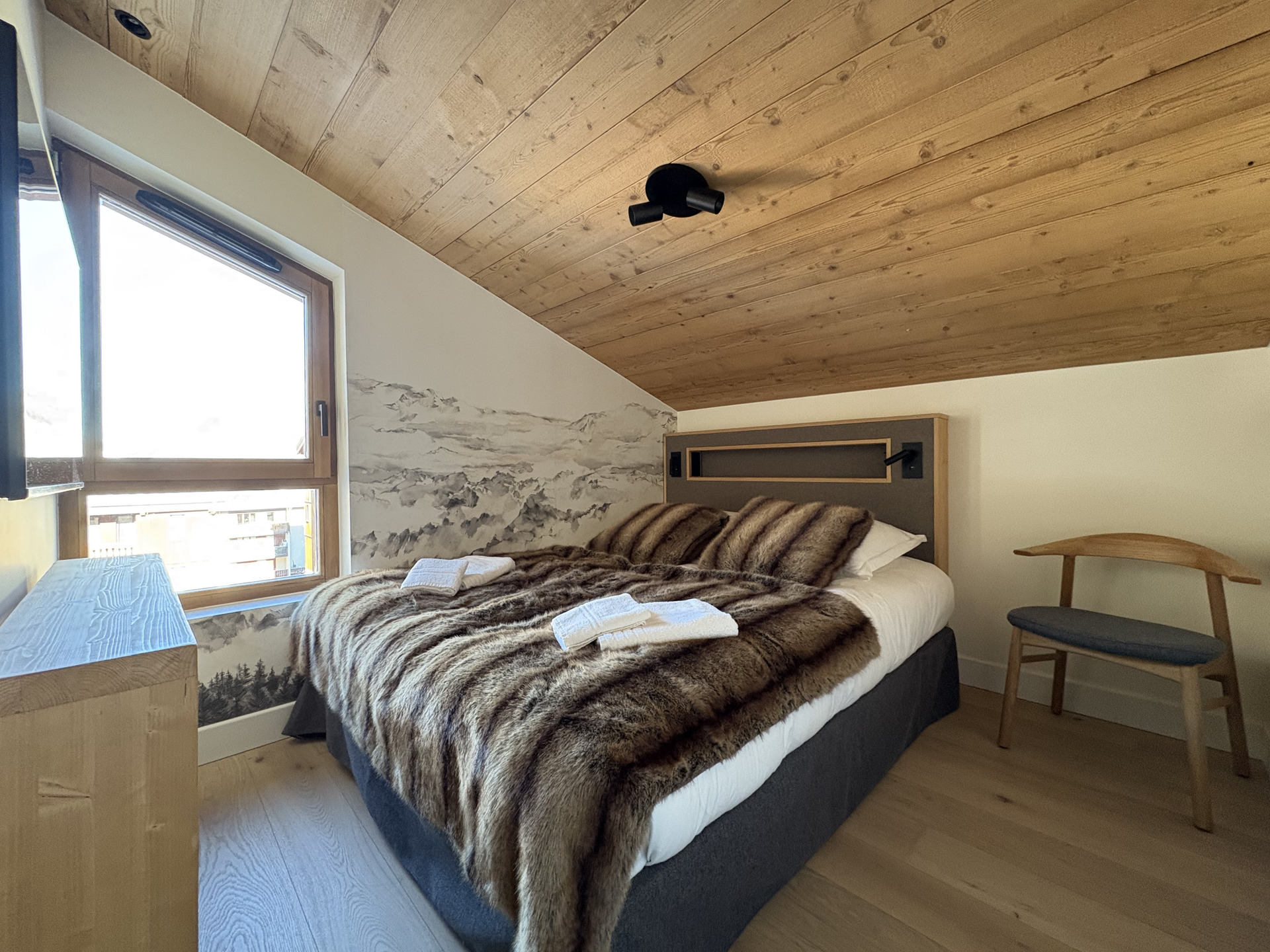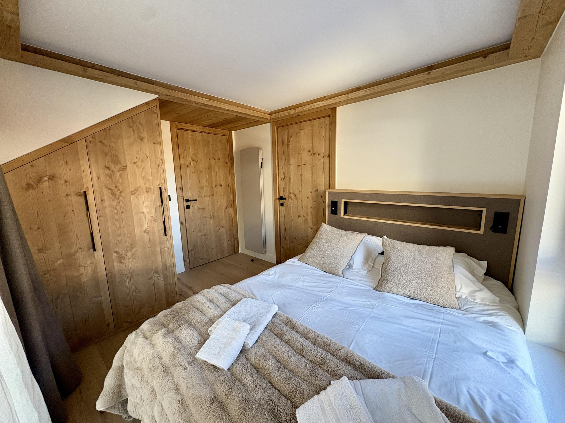 A 10-minute walk from the slopes, superb penthouse with a contemporary and warm chalet atmosphere, comprising 5 rooms on two floors, with a total surface area of 129 m², including 13 m² under the eaves, which can accommodate 8 people.