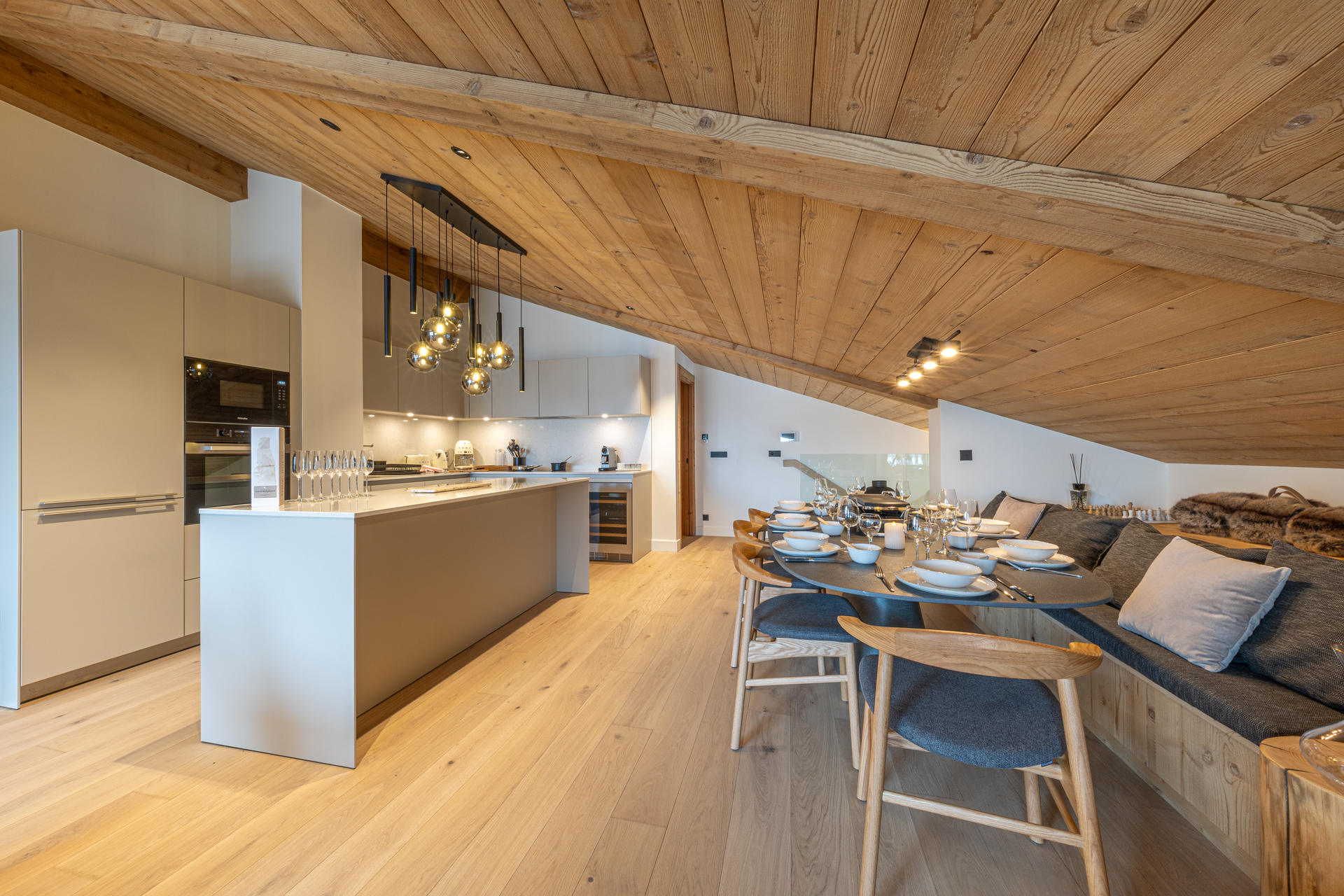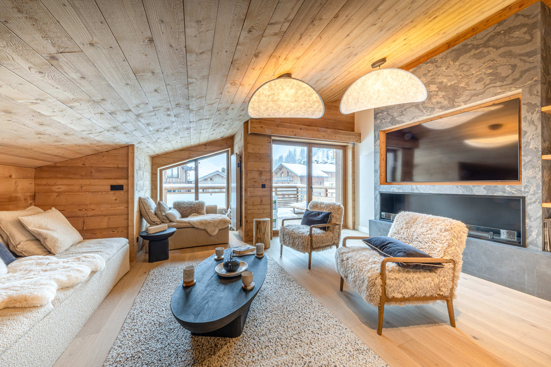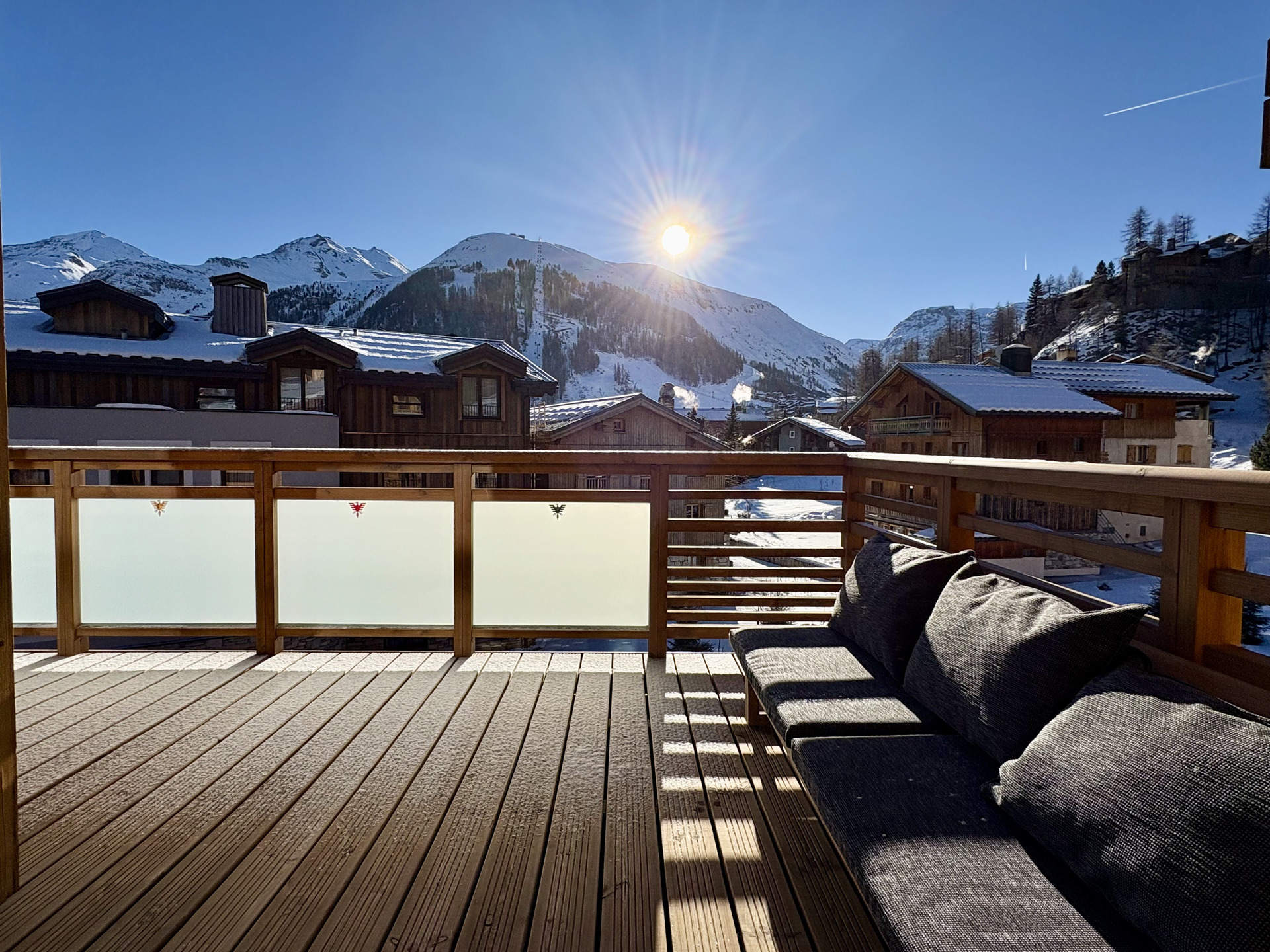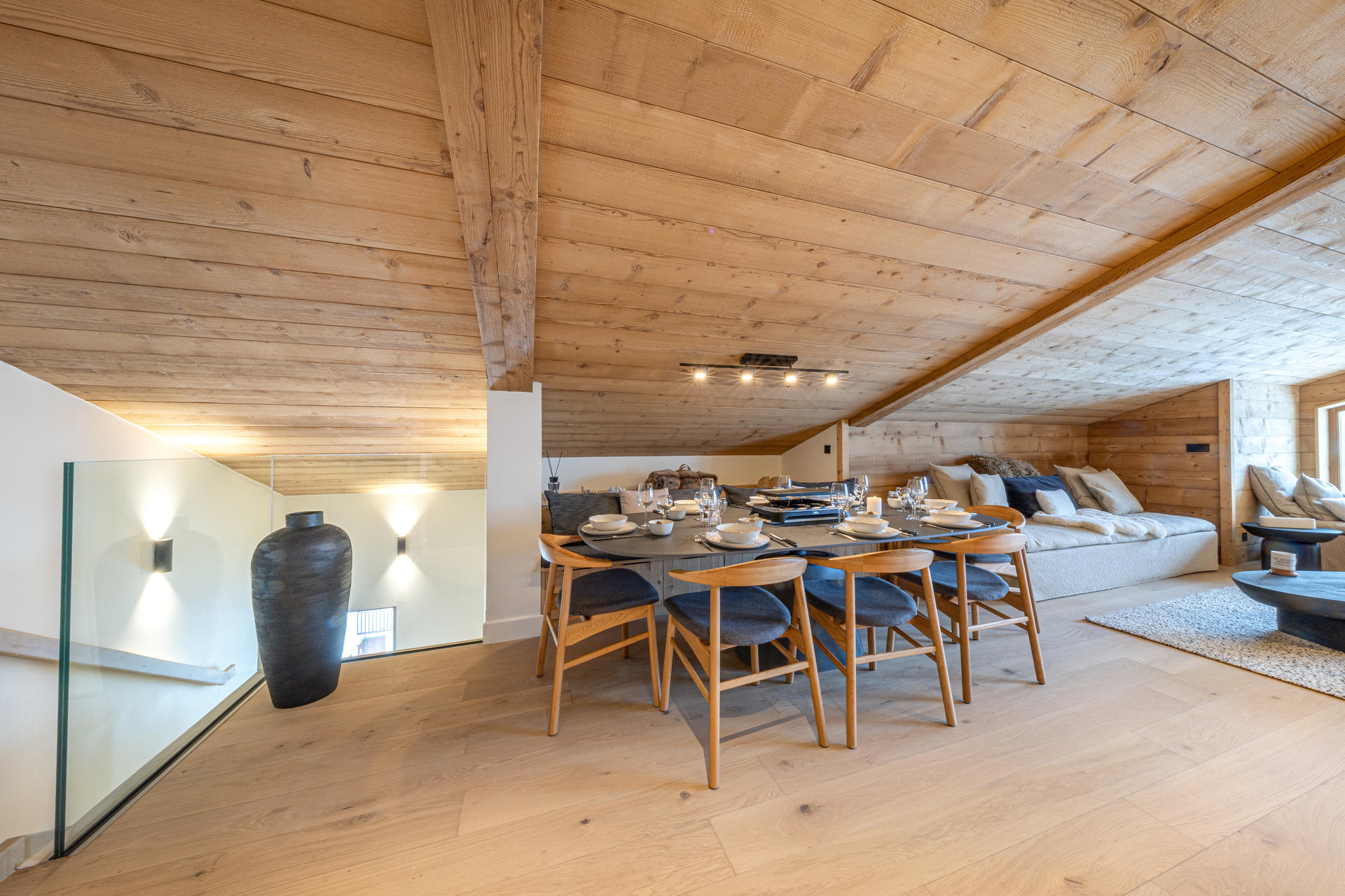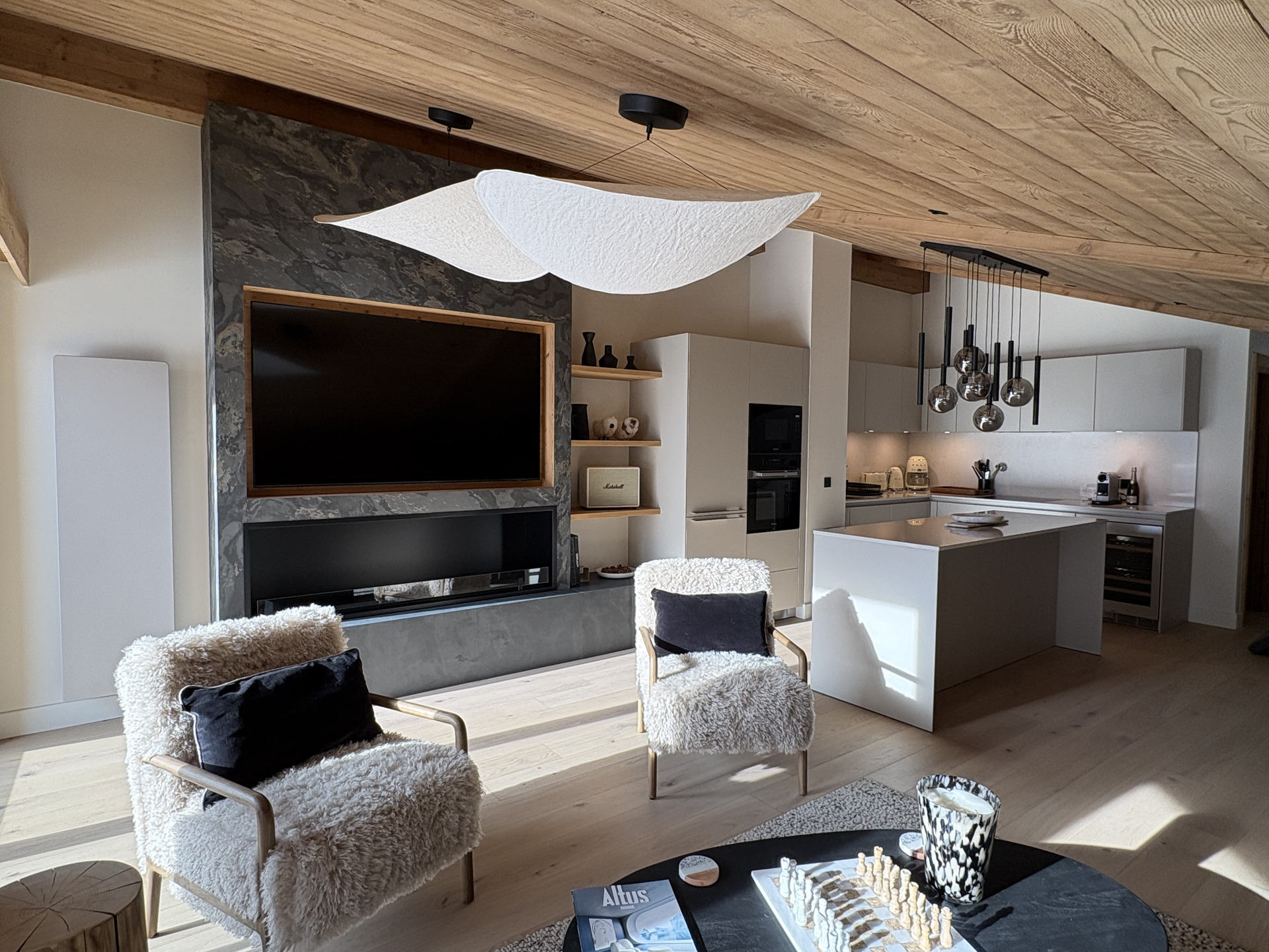 A 10-minute walk from the slopes, superb penthouse with a contemporary and warm chalet atmosphere, comprising 5 rooms on two floors, with a total surface area of 129 m², including 13 m² under the eaves, which can accommodate 8 people.