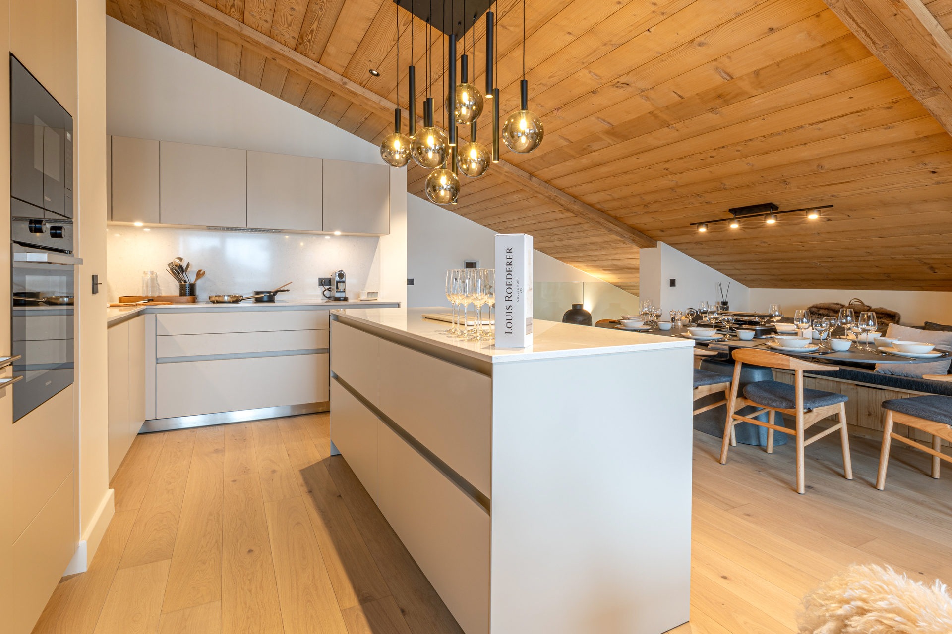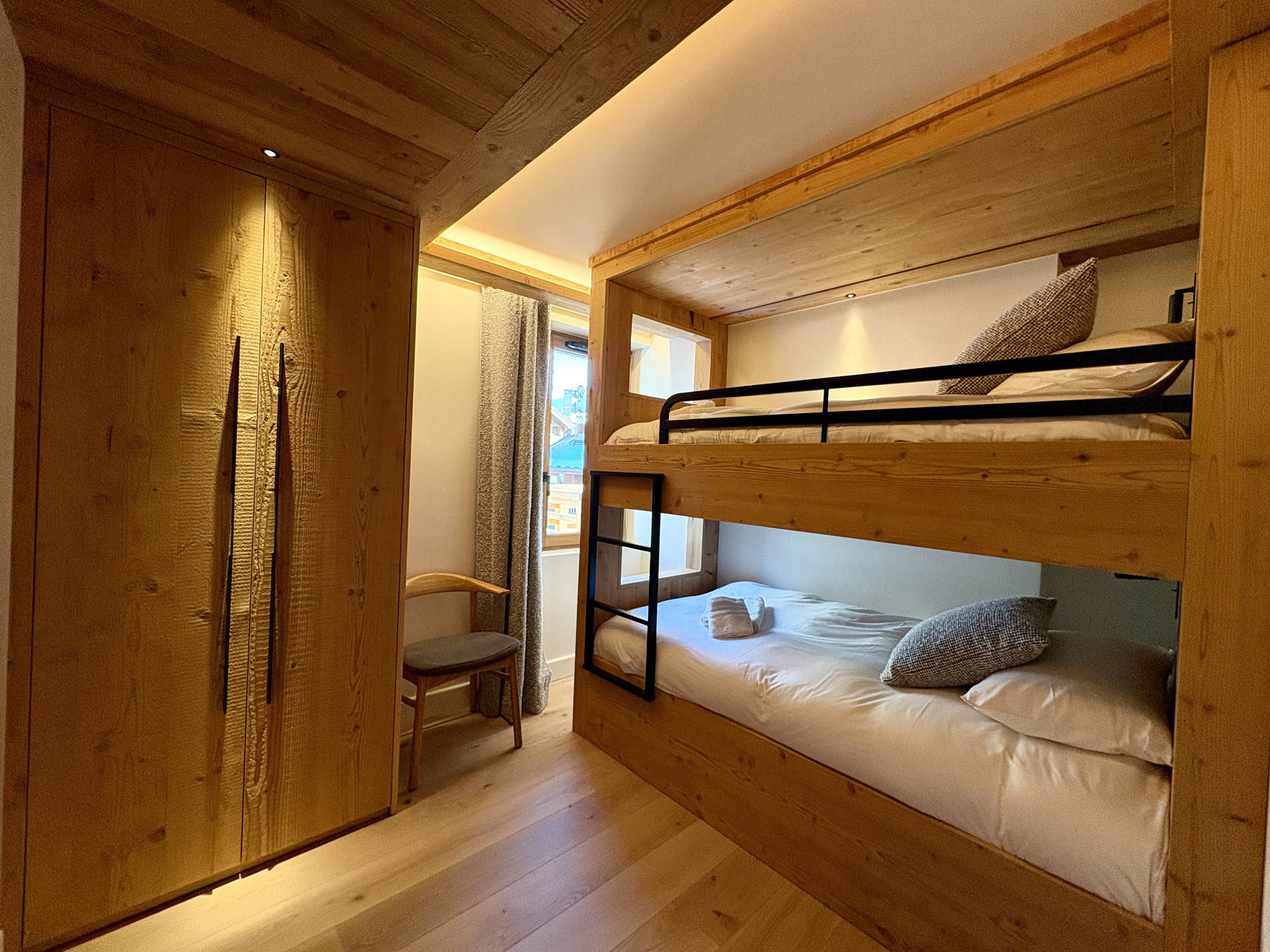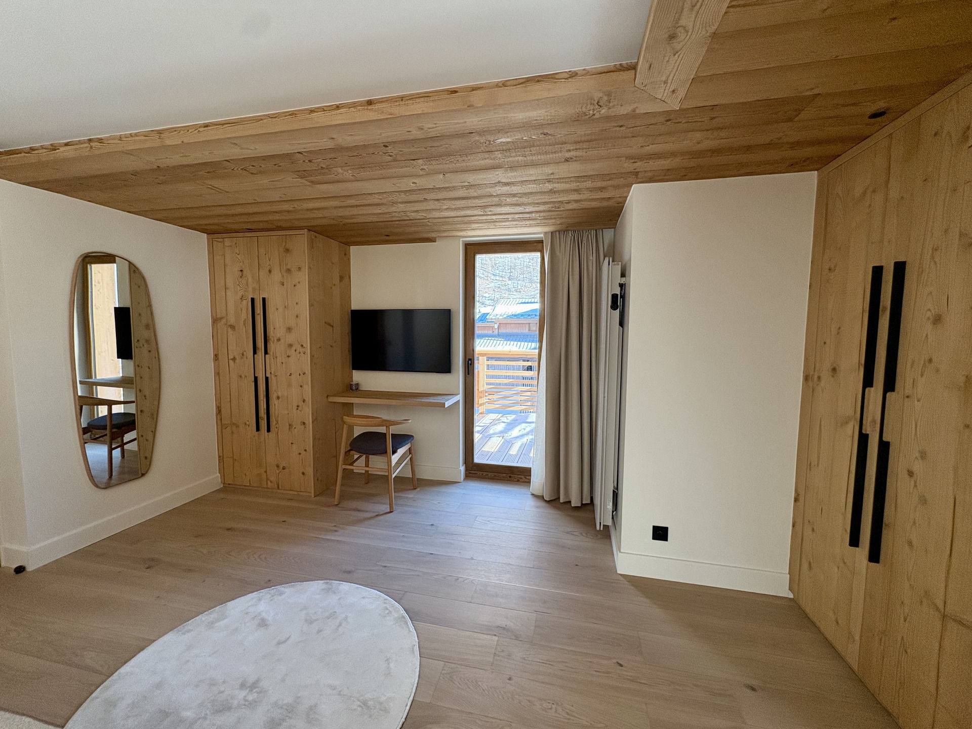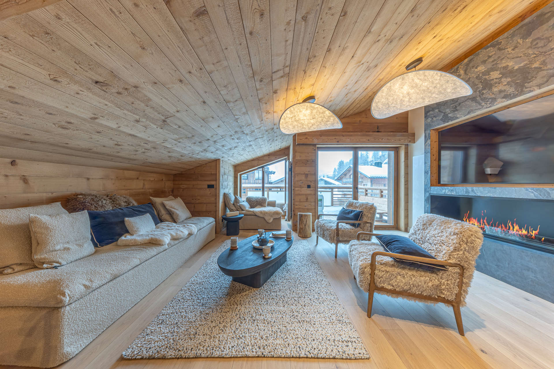 A 10-minute walk from the slopes, superb penthouse with a contemporary and warm chalet atmosphere, comprising 5 rooms on two floors, with a total surface area of 129 m², including 13 m² under the eaves, which can accommodate 8 people.