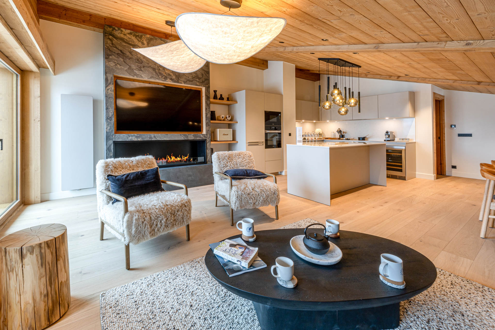 Large living room with balcony overlooking the mountains, ethanol fireplace, flat-screen TV, and high ceilings.