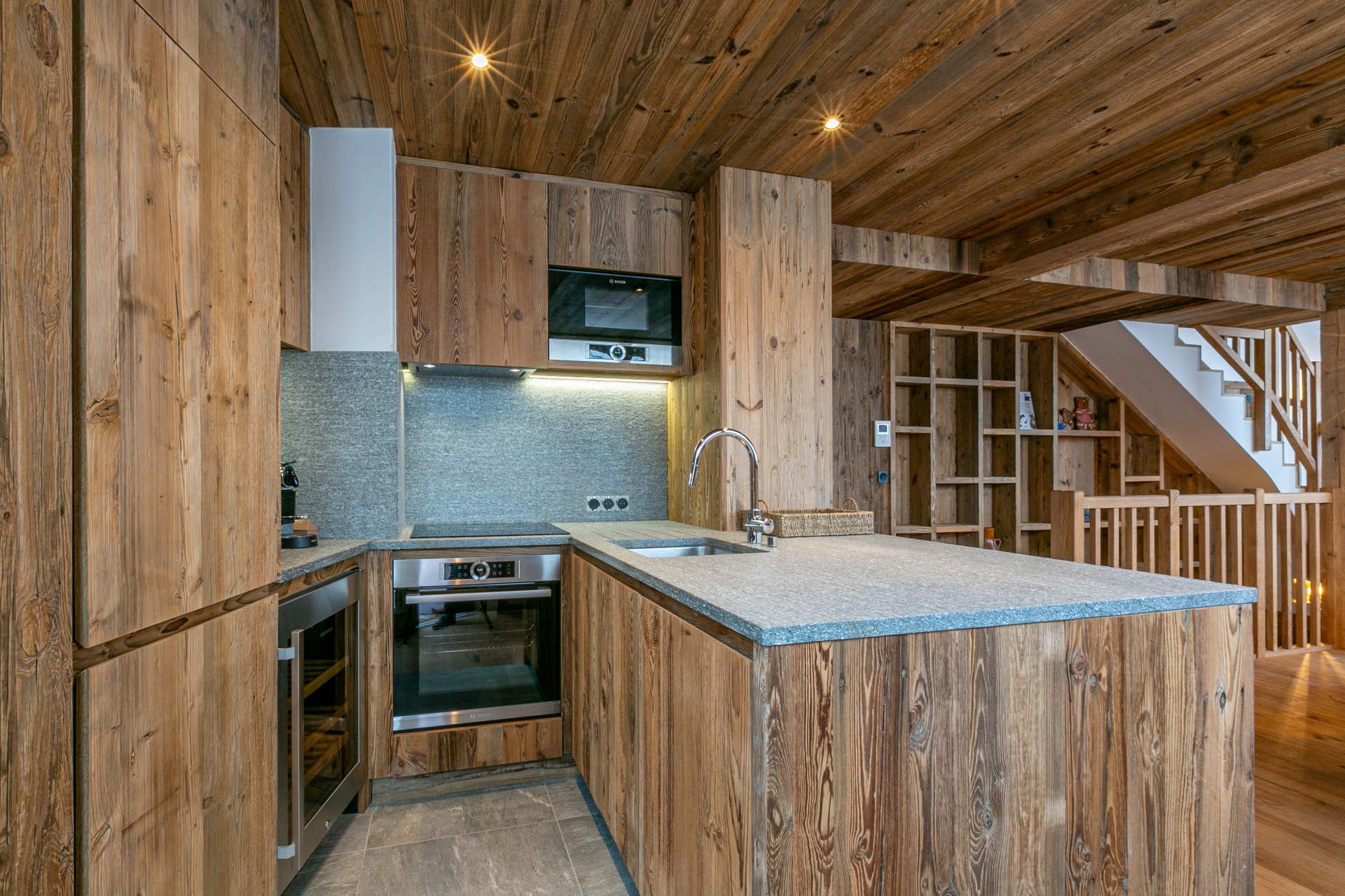 Equiped with oven and hood, microwave oven, dishwaher, large fridge with freezer, induction hob, wine celler