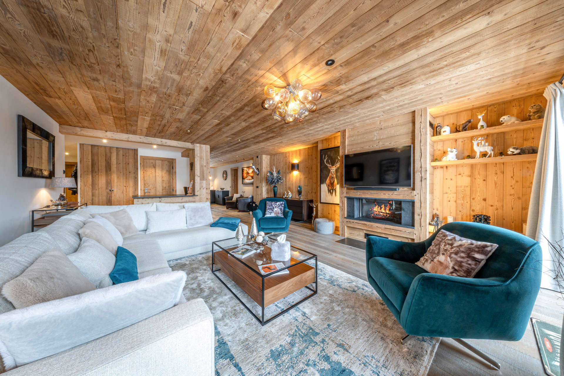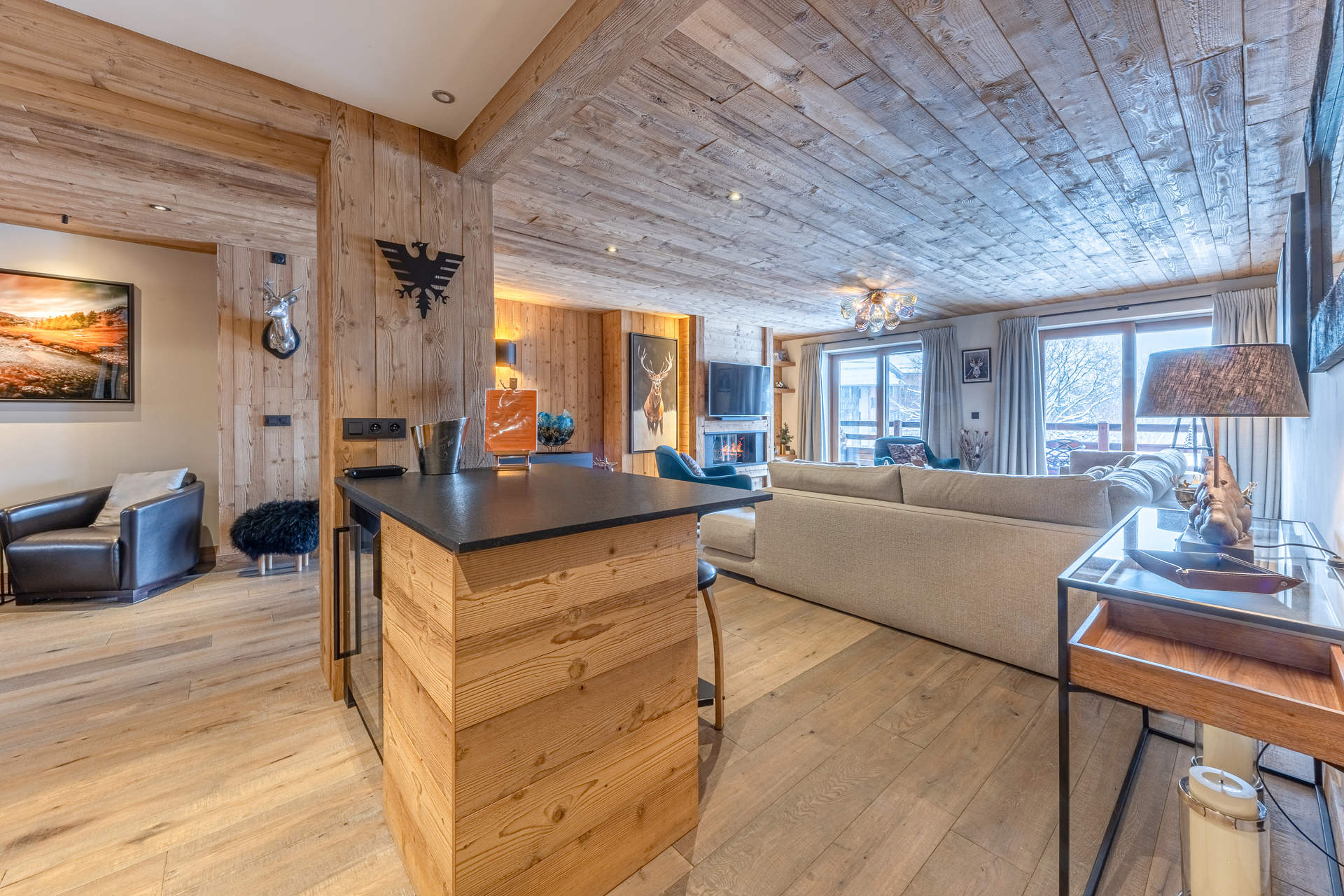 Interior of character combining contemporary decoration with an authentic Savoyard touch and warm architecture made of reclaimed timber and stone.