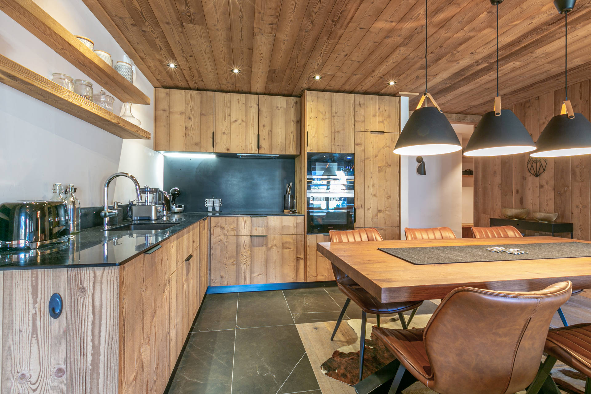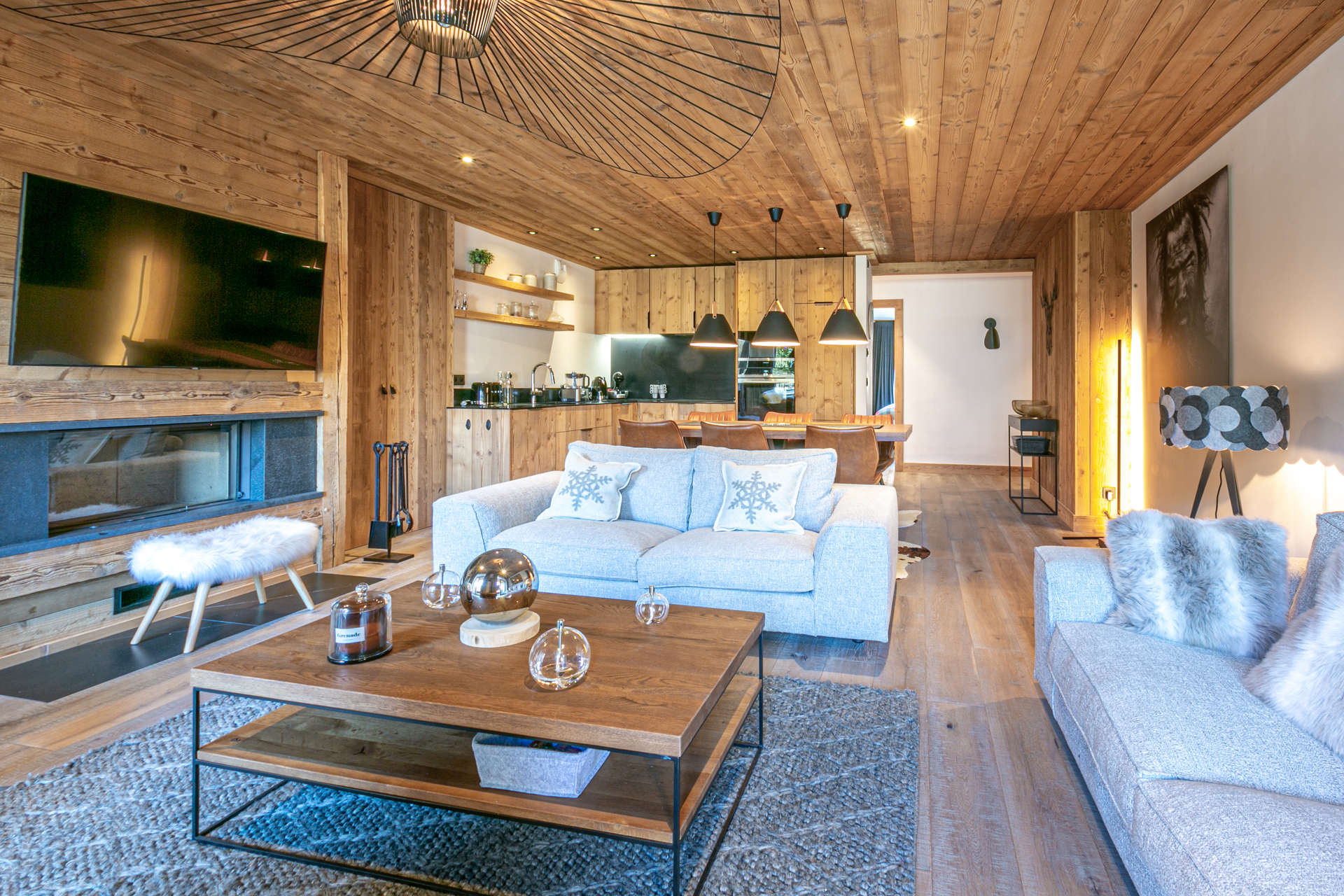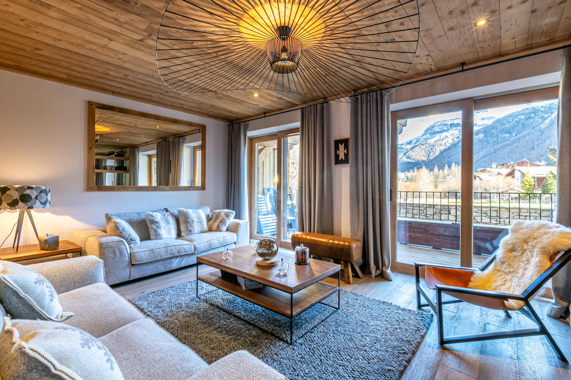 Interior of character combining contemporary decoration with an authentic mountain touch and warm architecture made of reclaimed wood and stone.