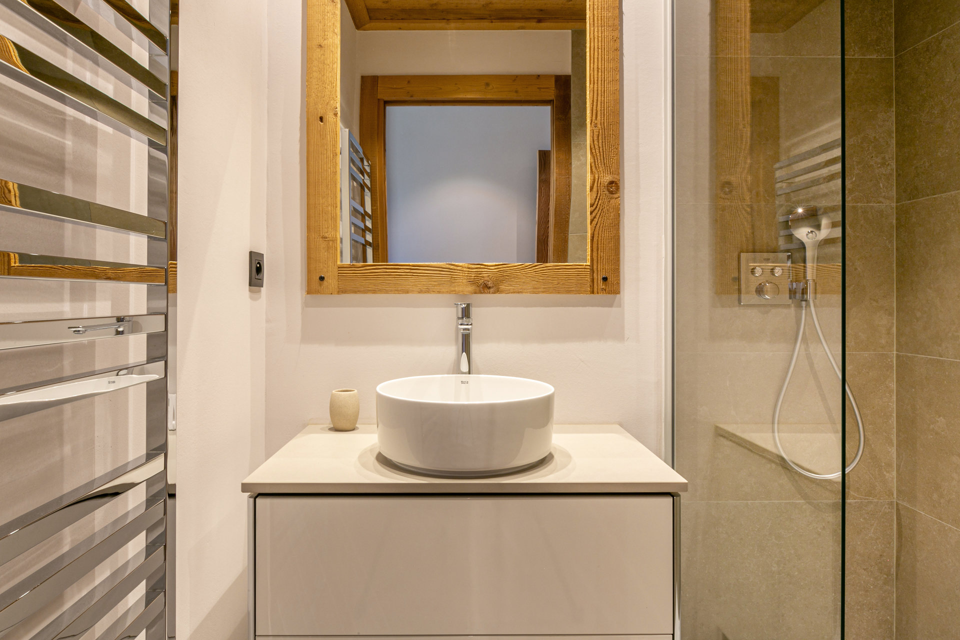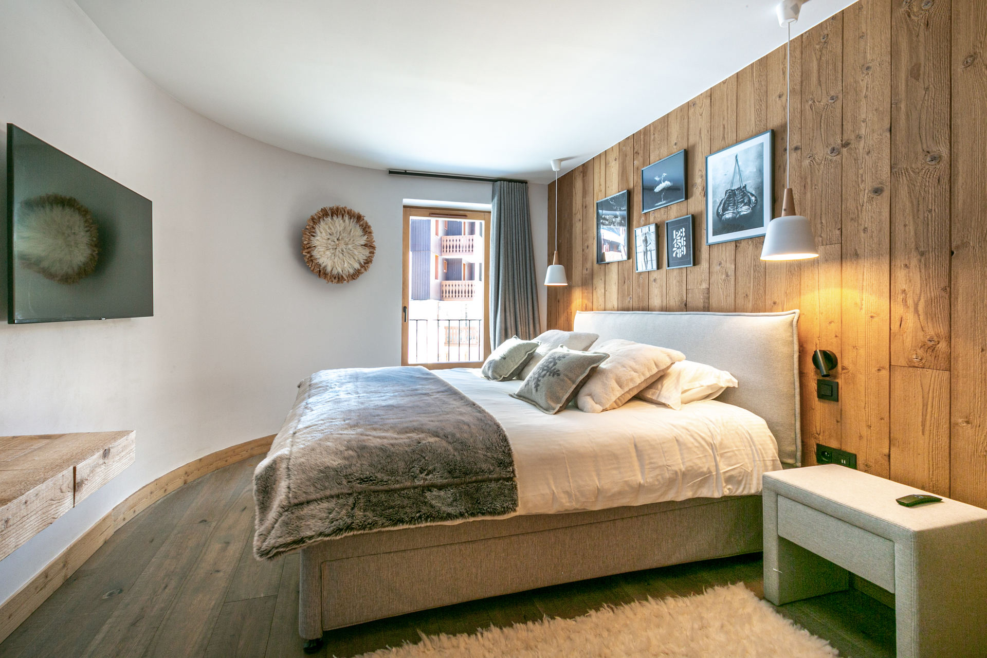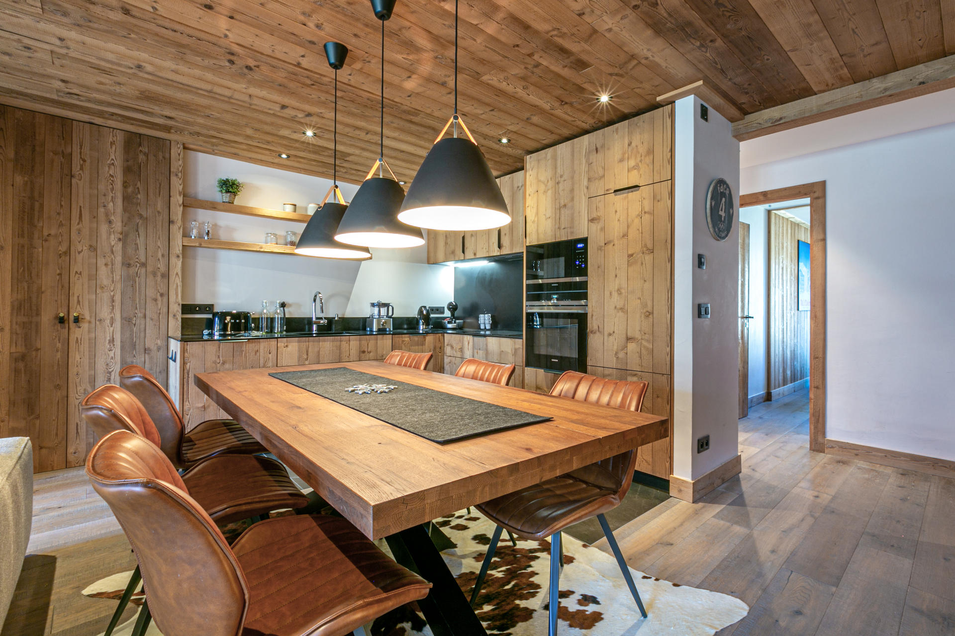 Interior of character combining contemporary decoration with an authentic mountain touch and warm architecture made of reclaimed wood and stone.