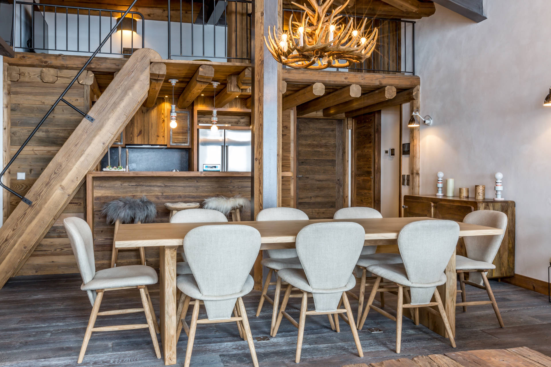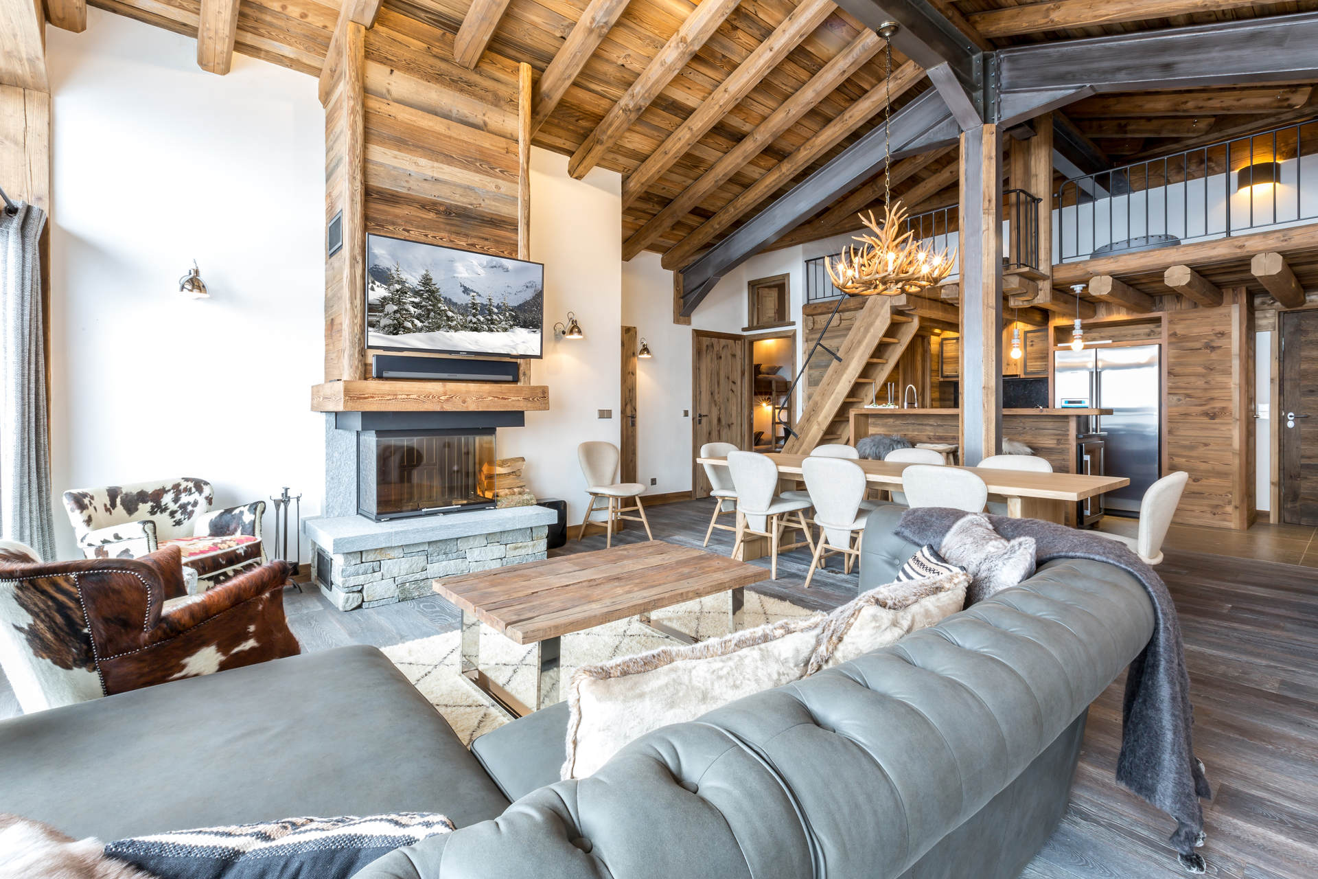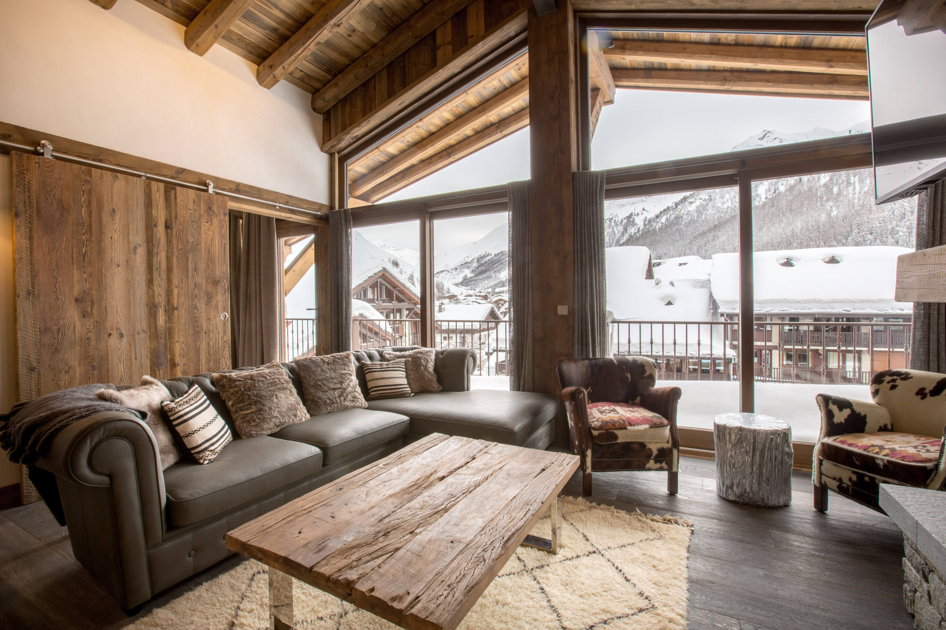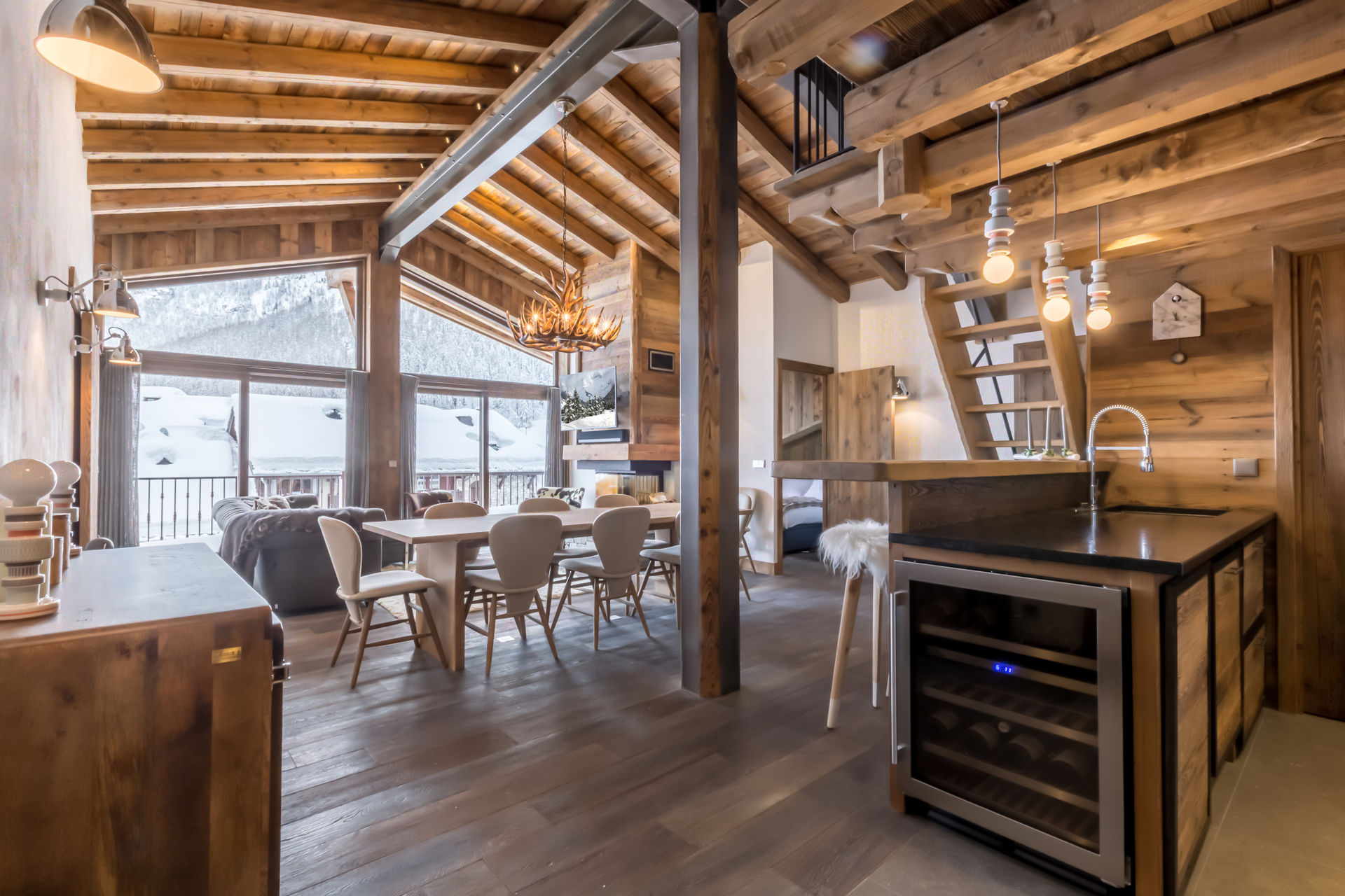 Interior of character combining contemporary decoration with authentic Savoyard and warm architecture made of wood and stone