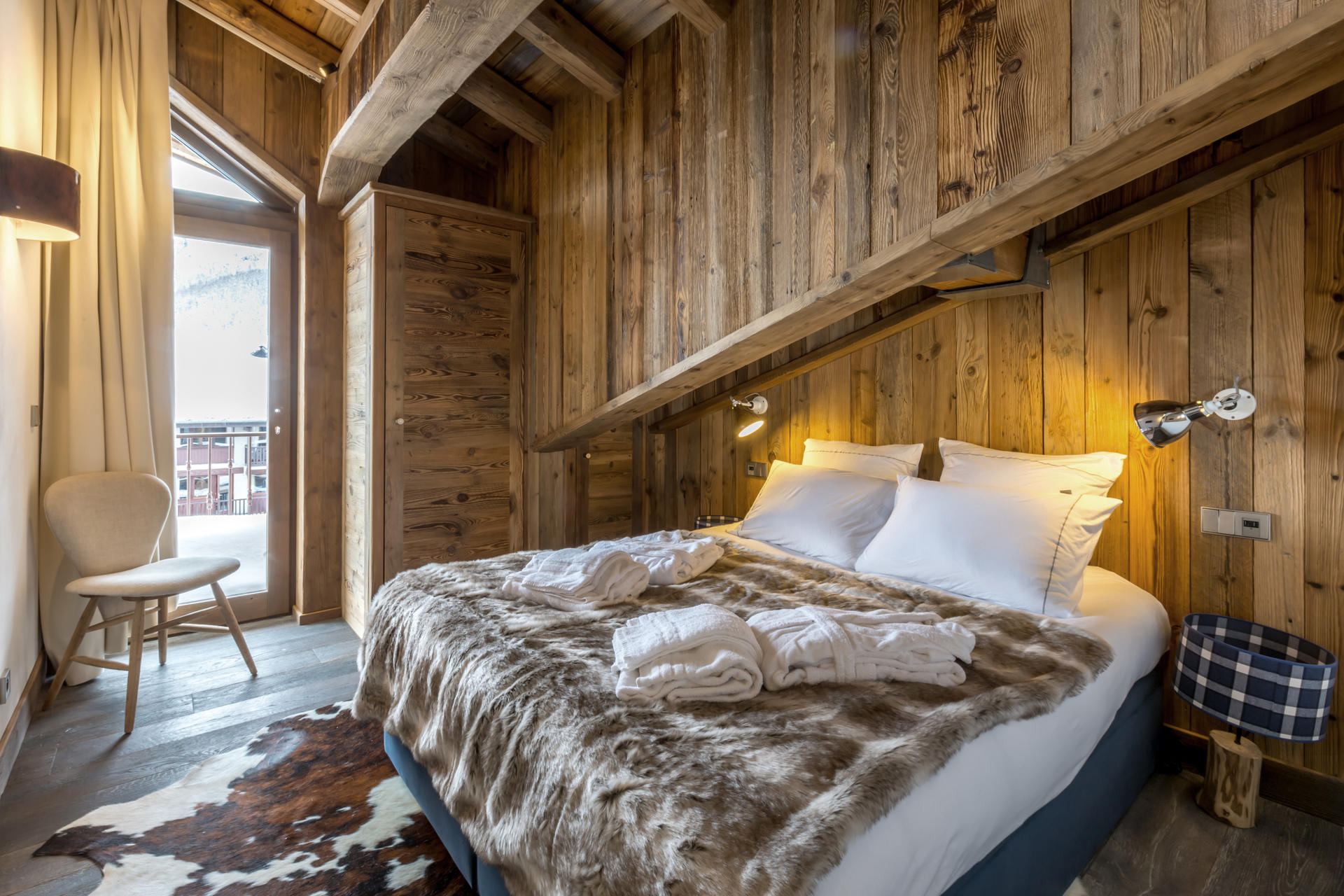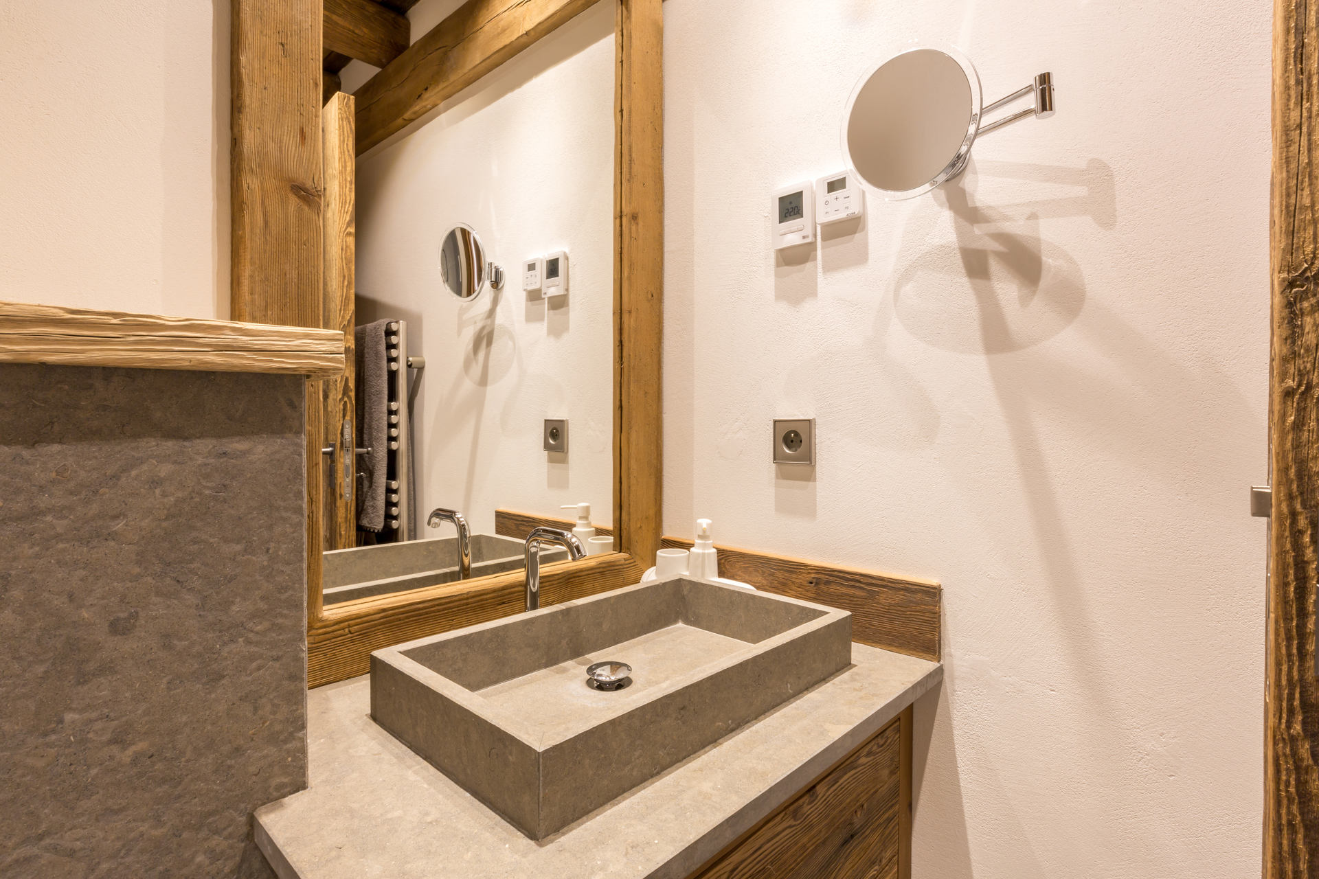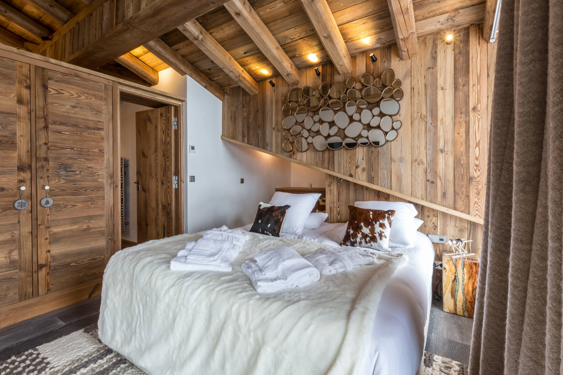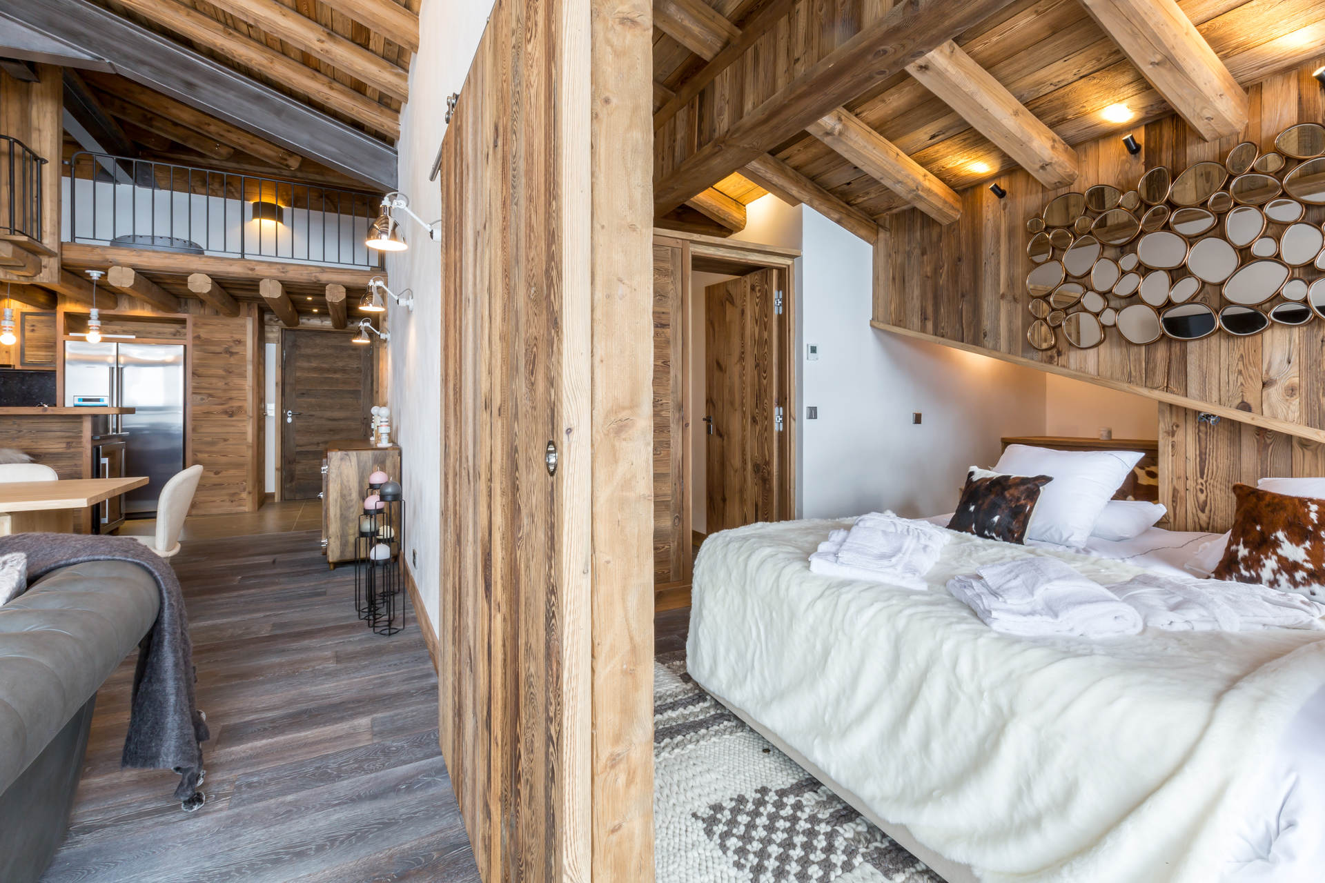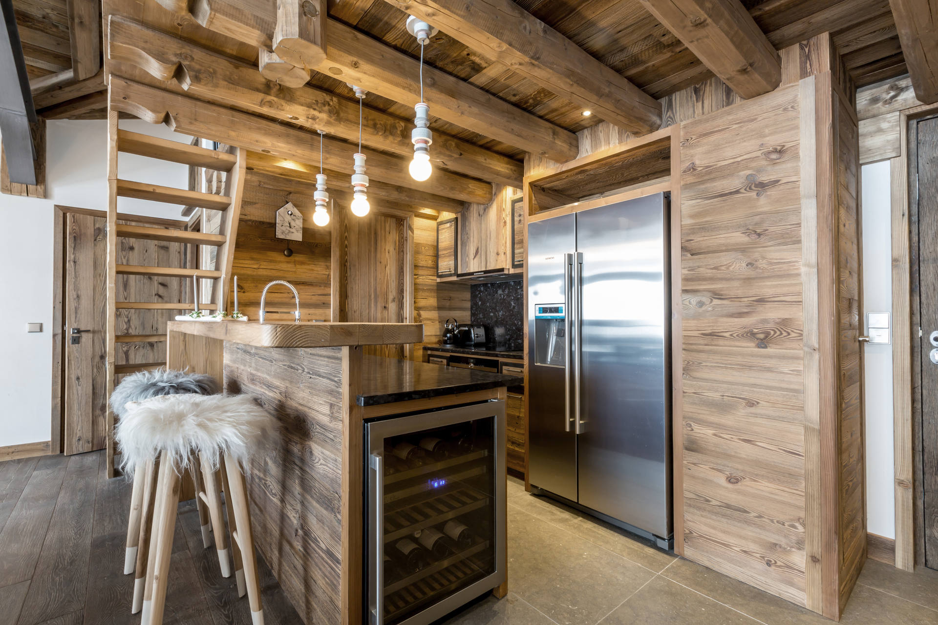 Interior of character combining contemporary decoration with authentic Savoyard and warm architecture made of wood and stone