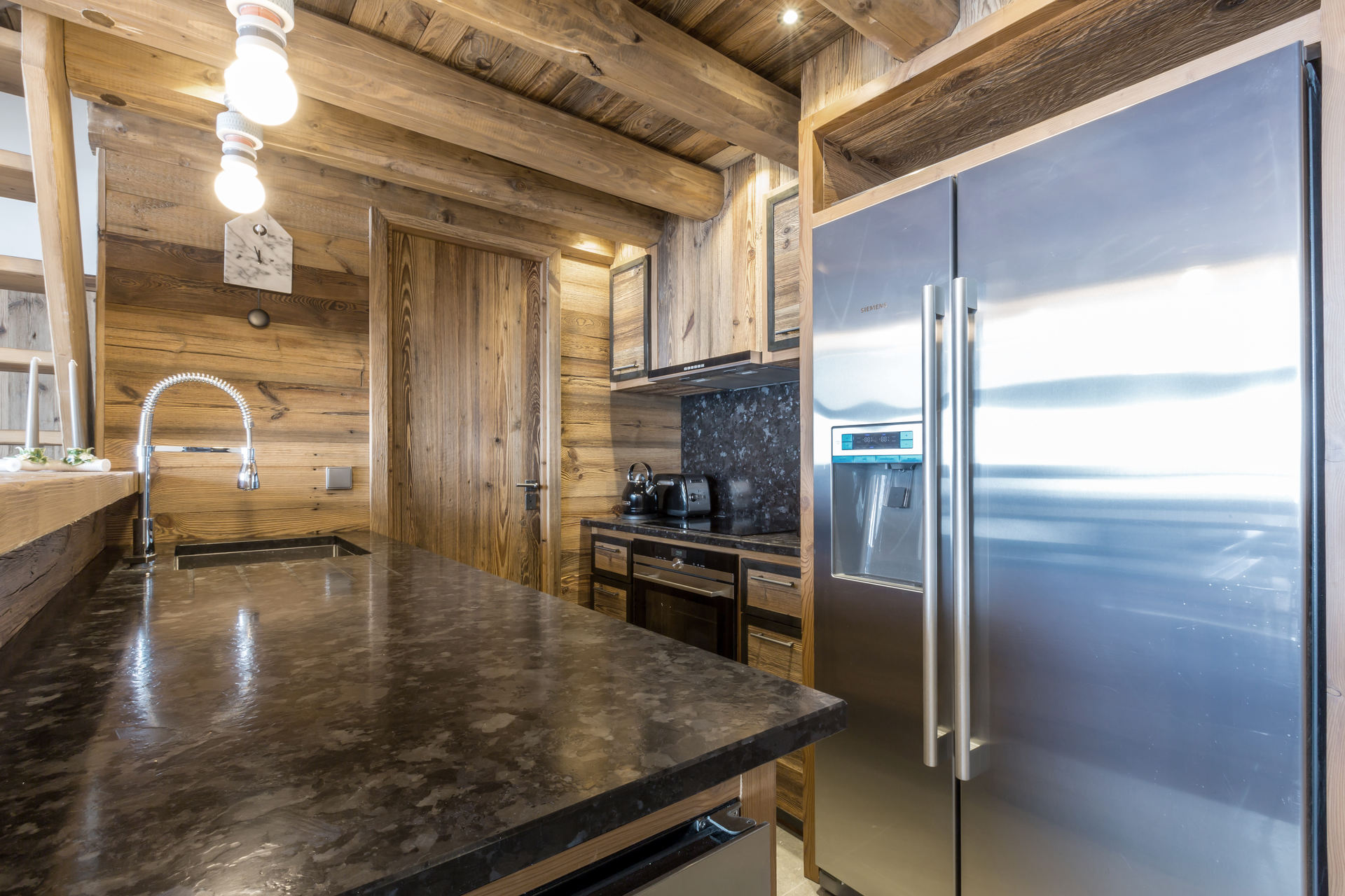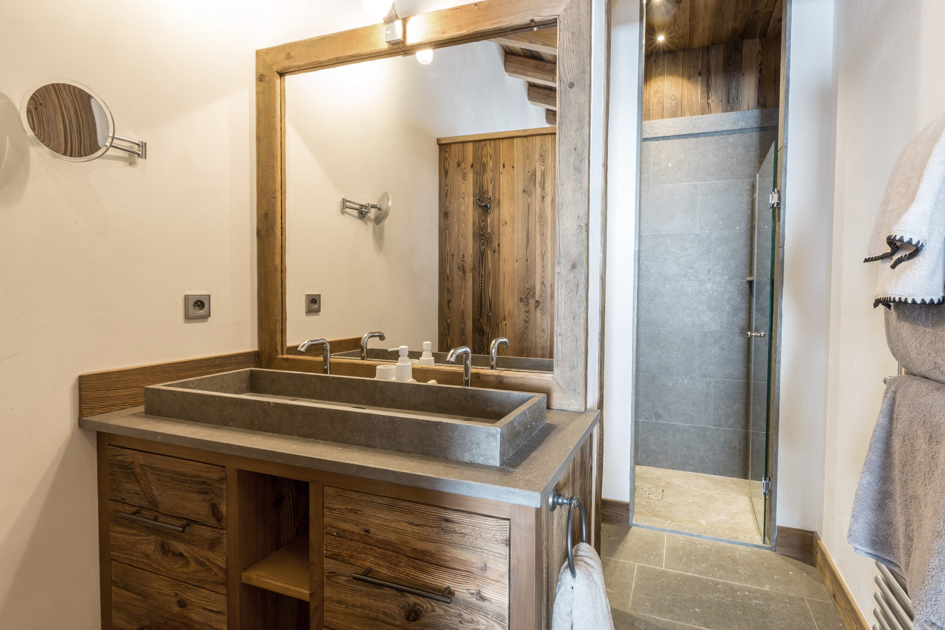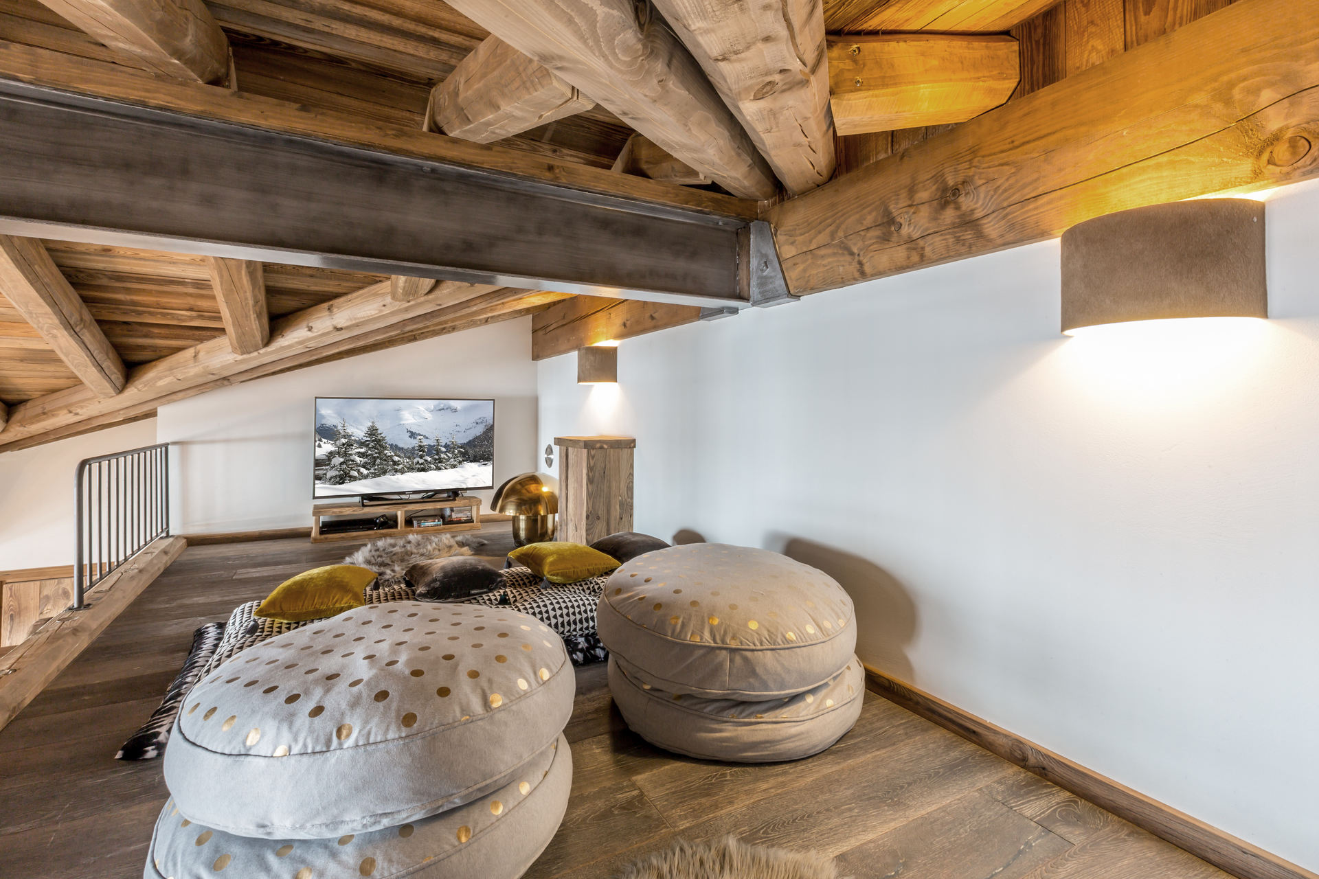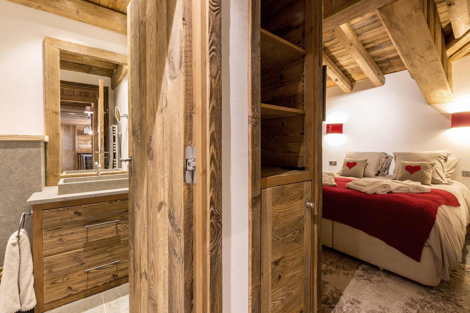 Interior of character combining contemporary decoration with authentic Savoyard and warm architecture made of wood and stone
