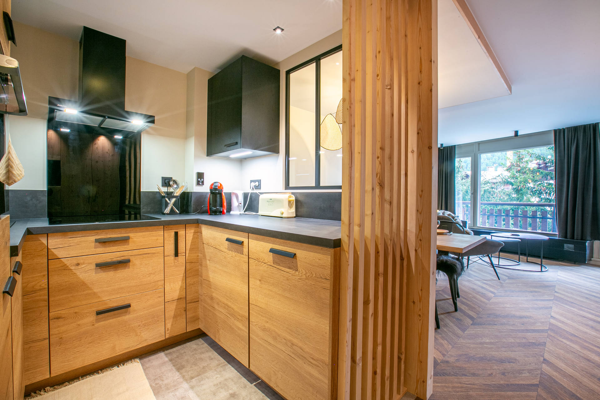 Equipped with fridge ansd frezzer, dishwasher, hood, induction hob, microwave/oven