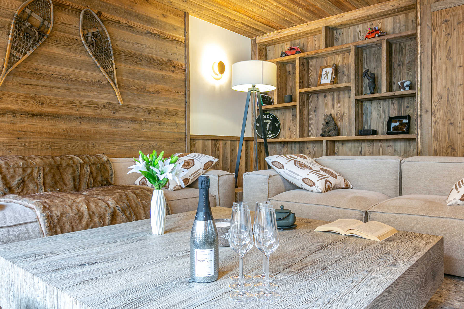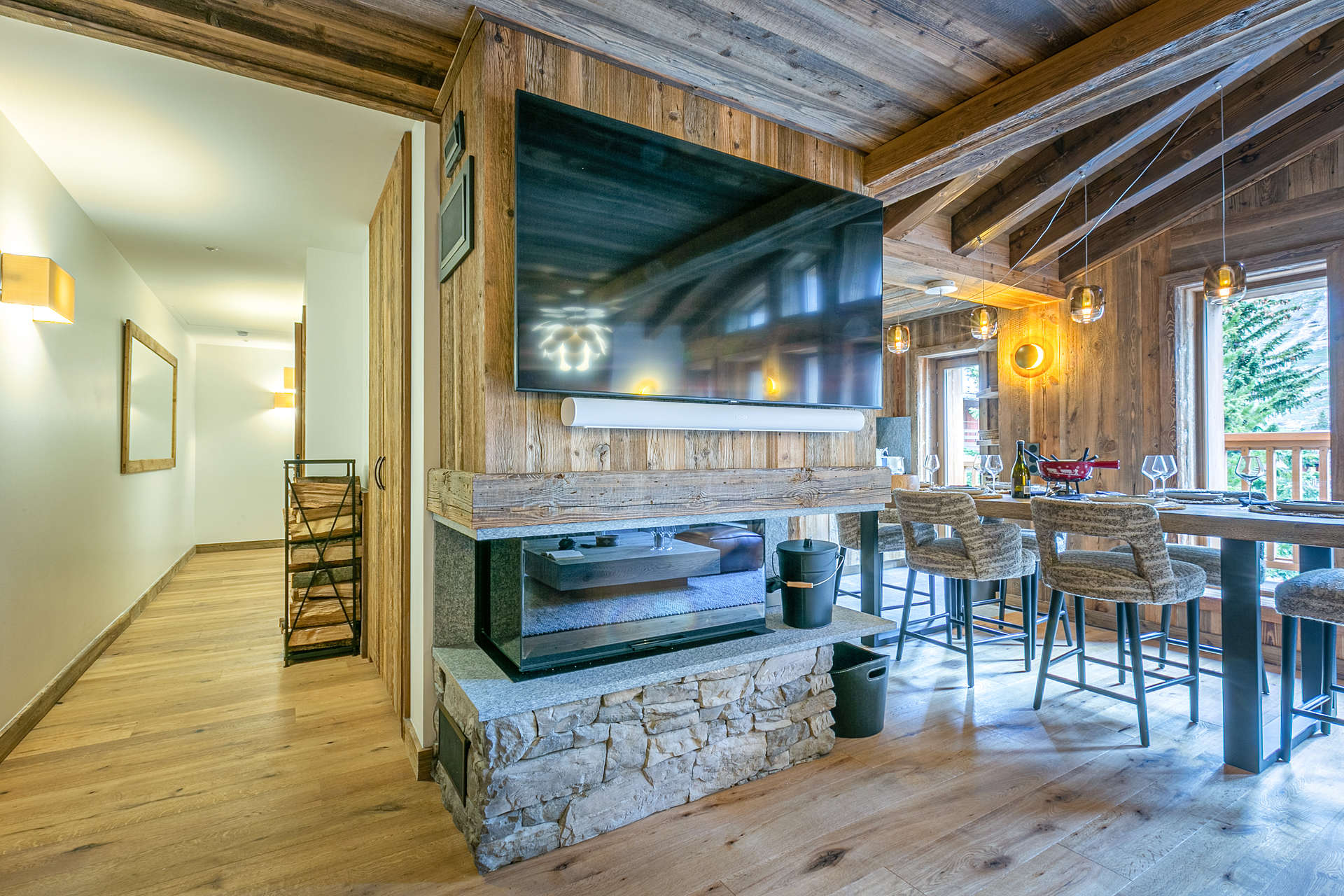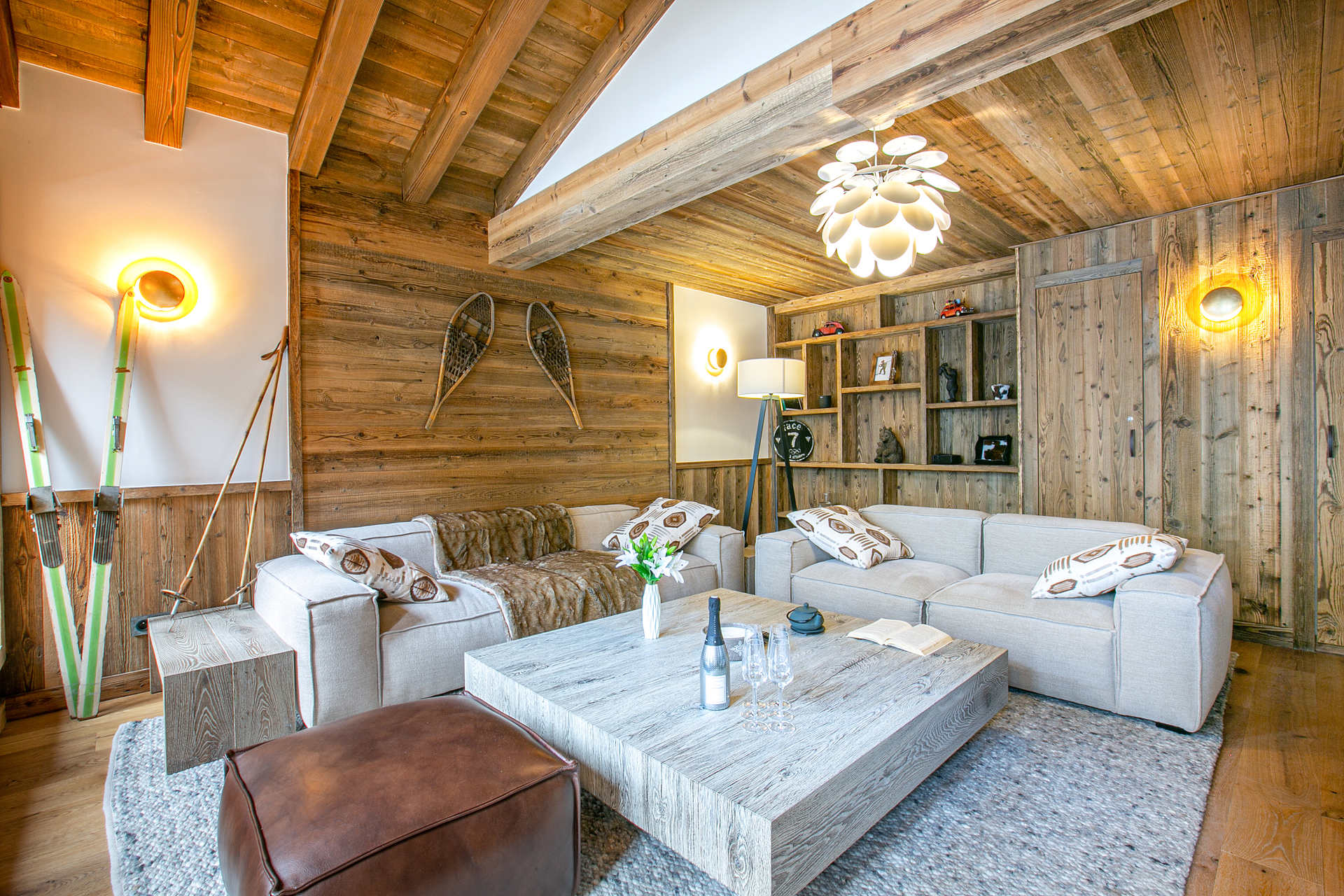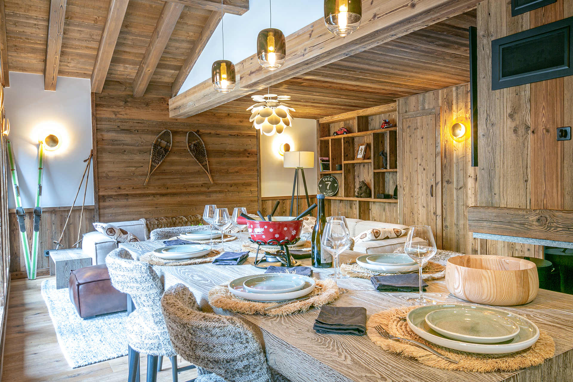 Interior of character combining contemporary decoration with an authentic Savoyard touch and warm architecture made of reclaimed timber and stone.