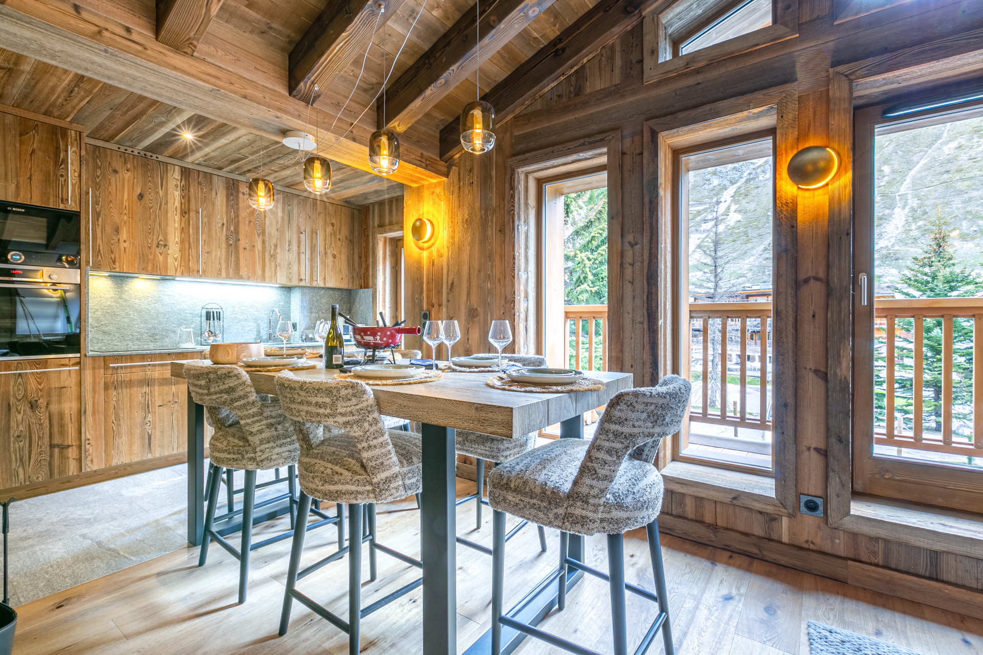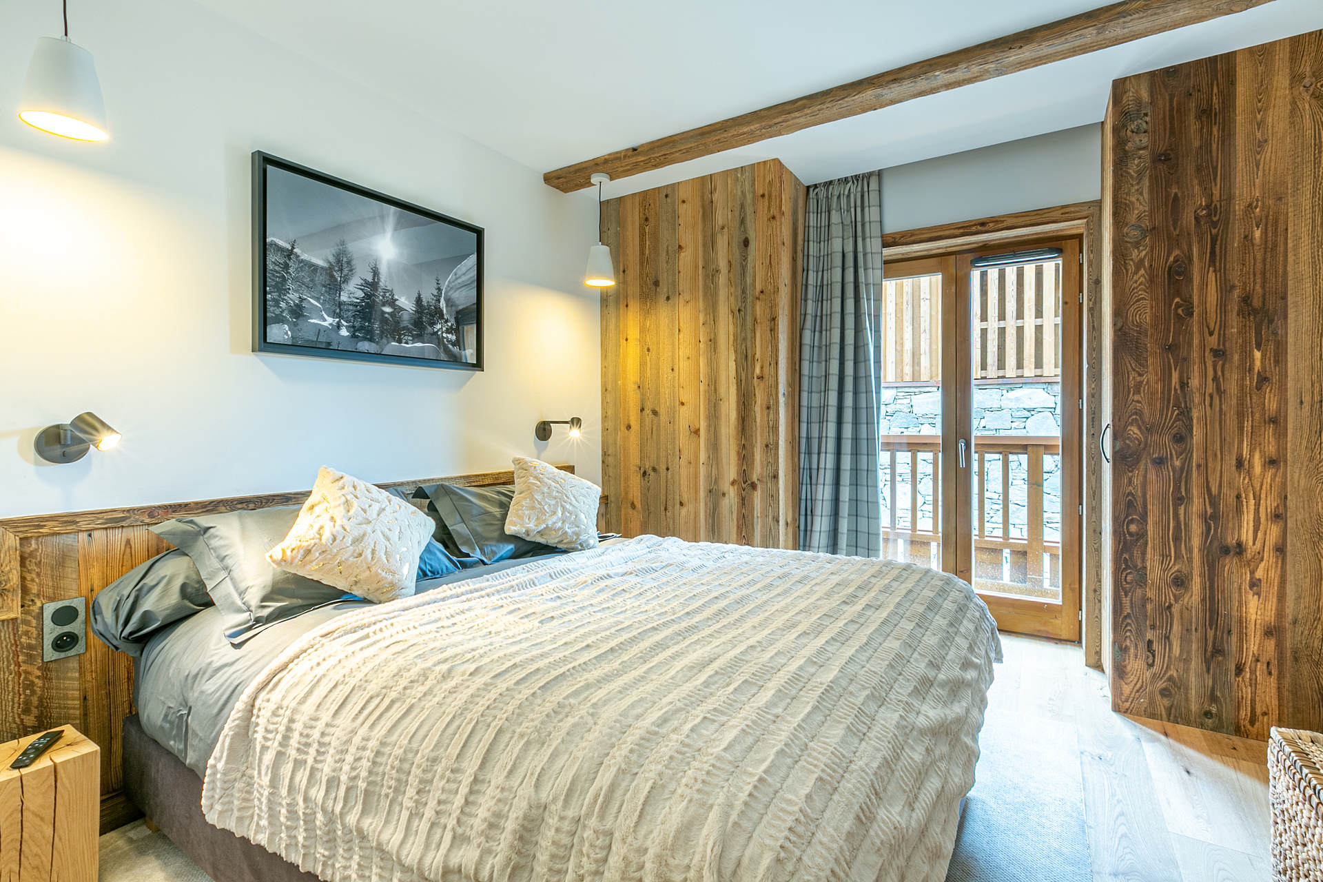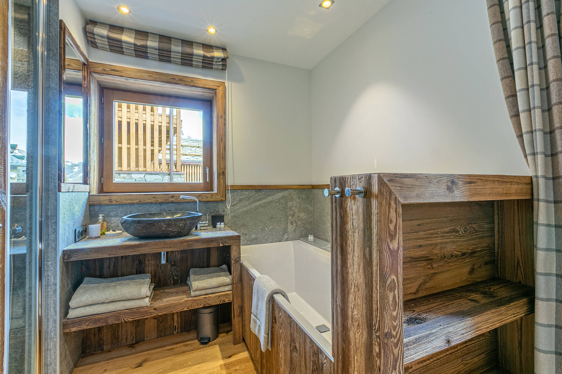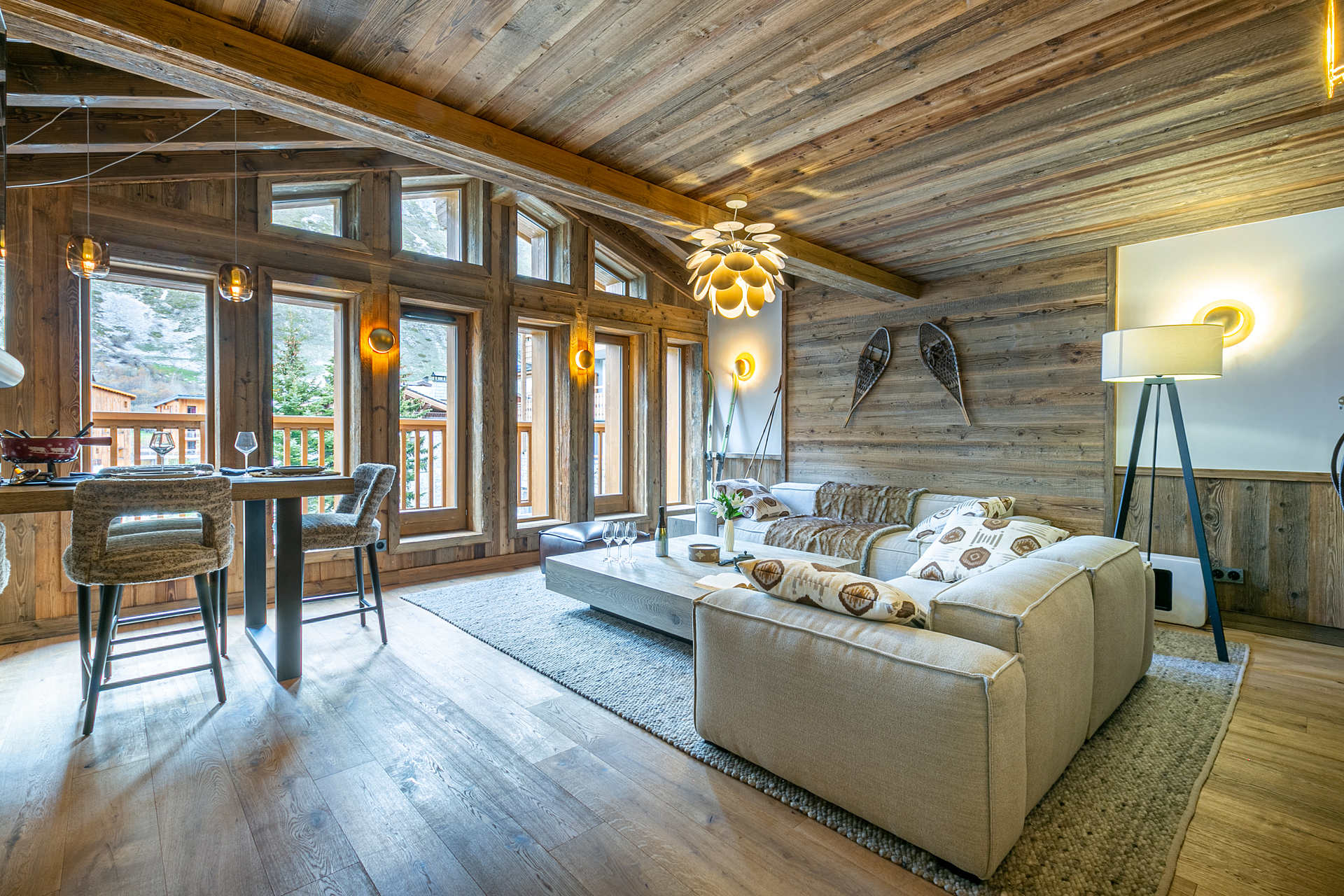 Interior of character combining contemporary decoration with an authentic Savoyard touch and warm architecture made of reclaimed timber and stone.