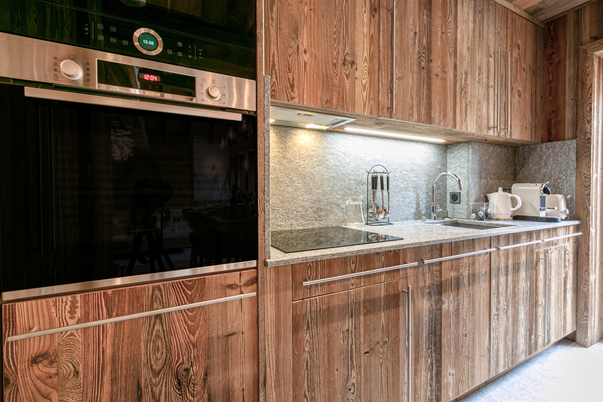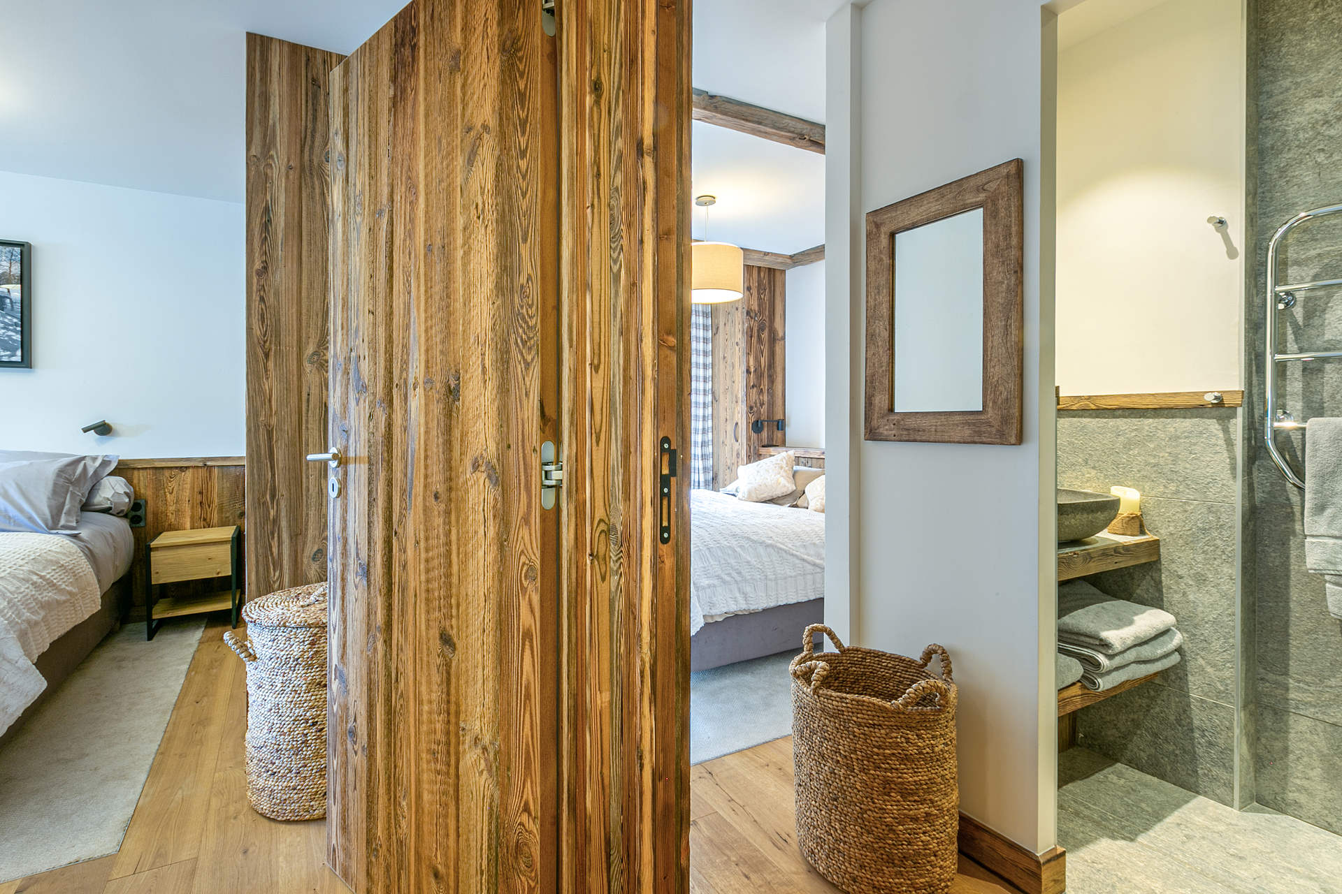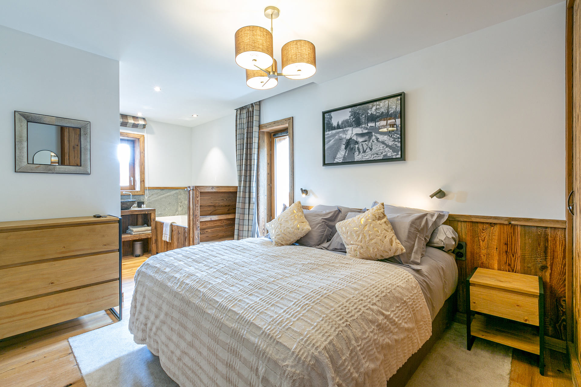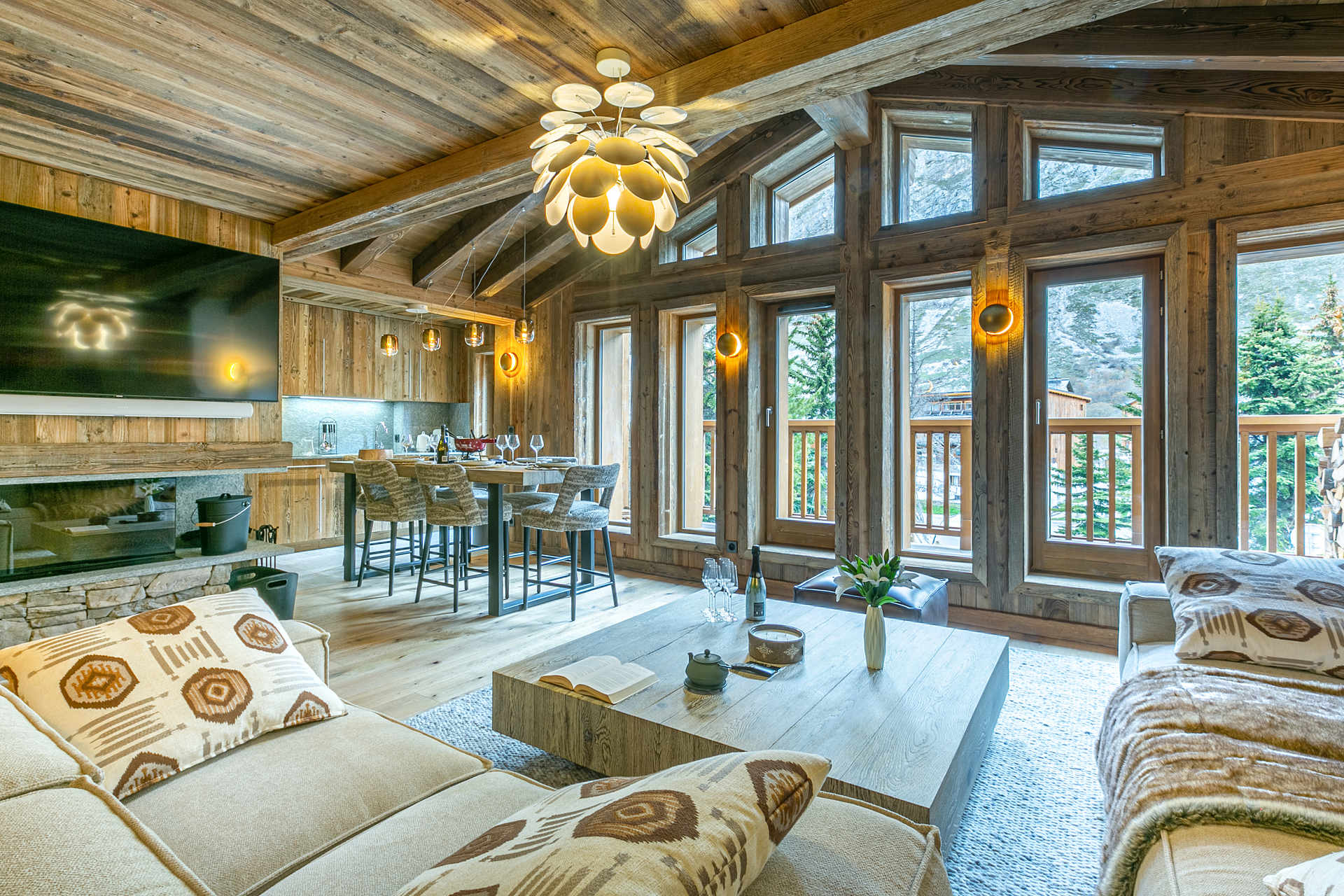 Interior of character combining contemporary decoration with an authentic Savoyard touch and warm architecture made of reclaimed timber and stone.