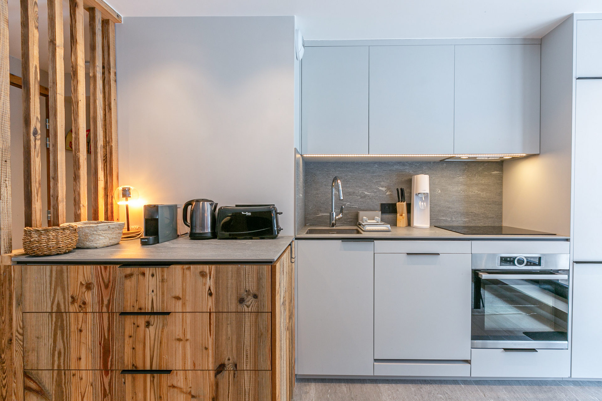 Small kitchen appliances: coffee machine nesspresso Krupps, kettle, toaster, raclette device, soda stream, blender.