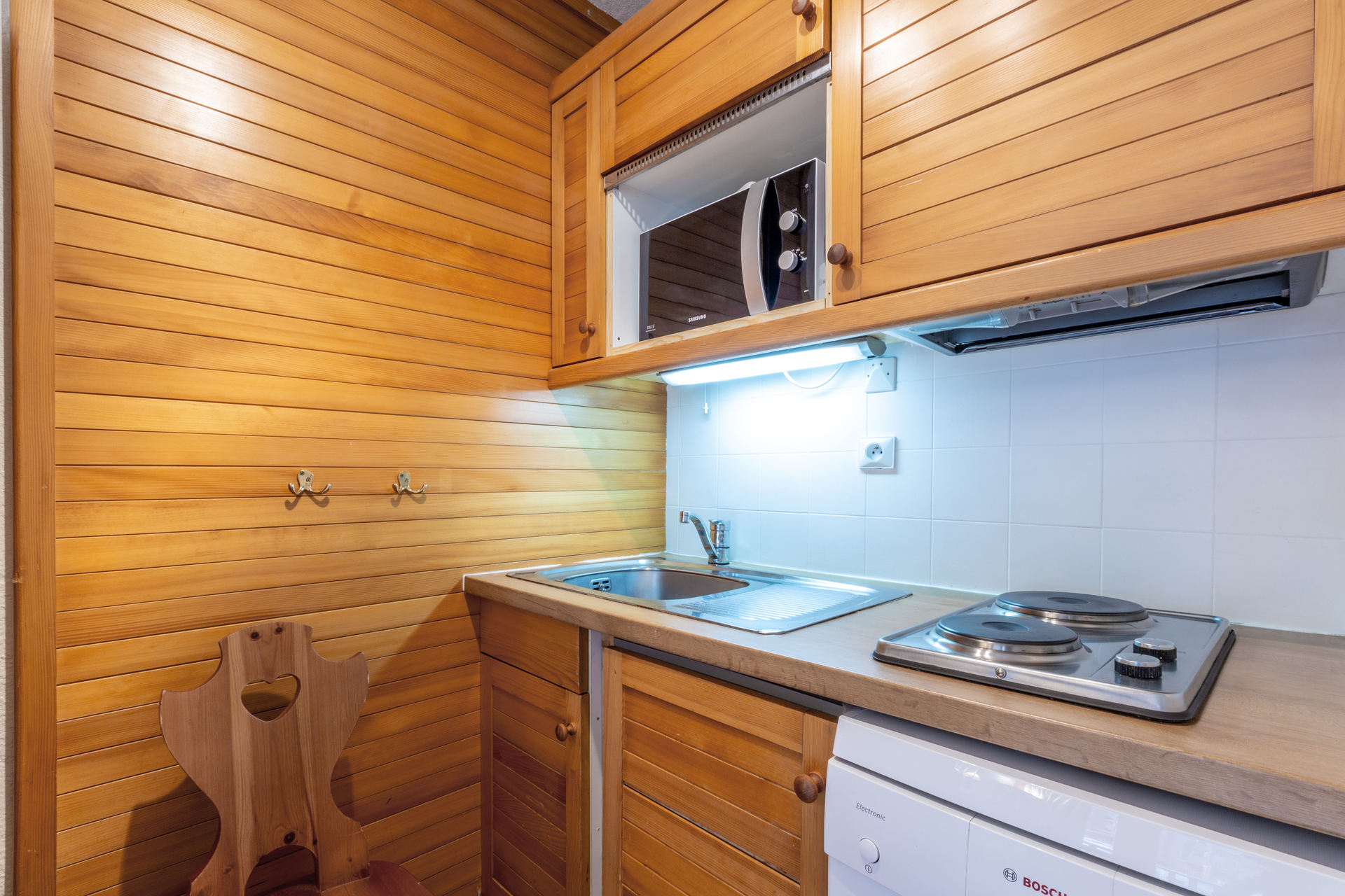 Equipped with dishwasher, hood, fridge with freezer, electric hob, microwave oven