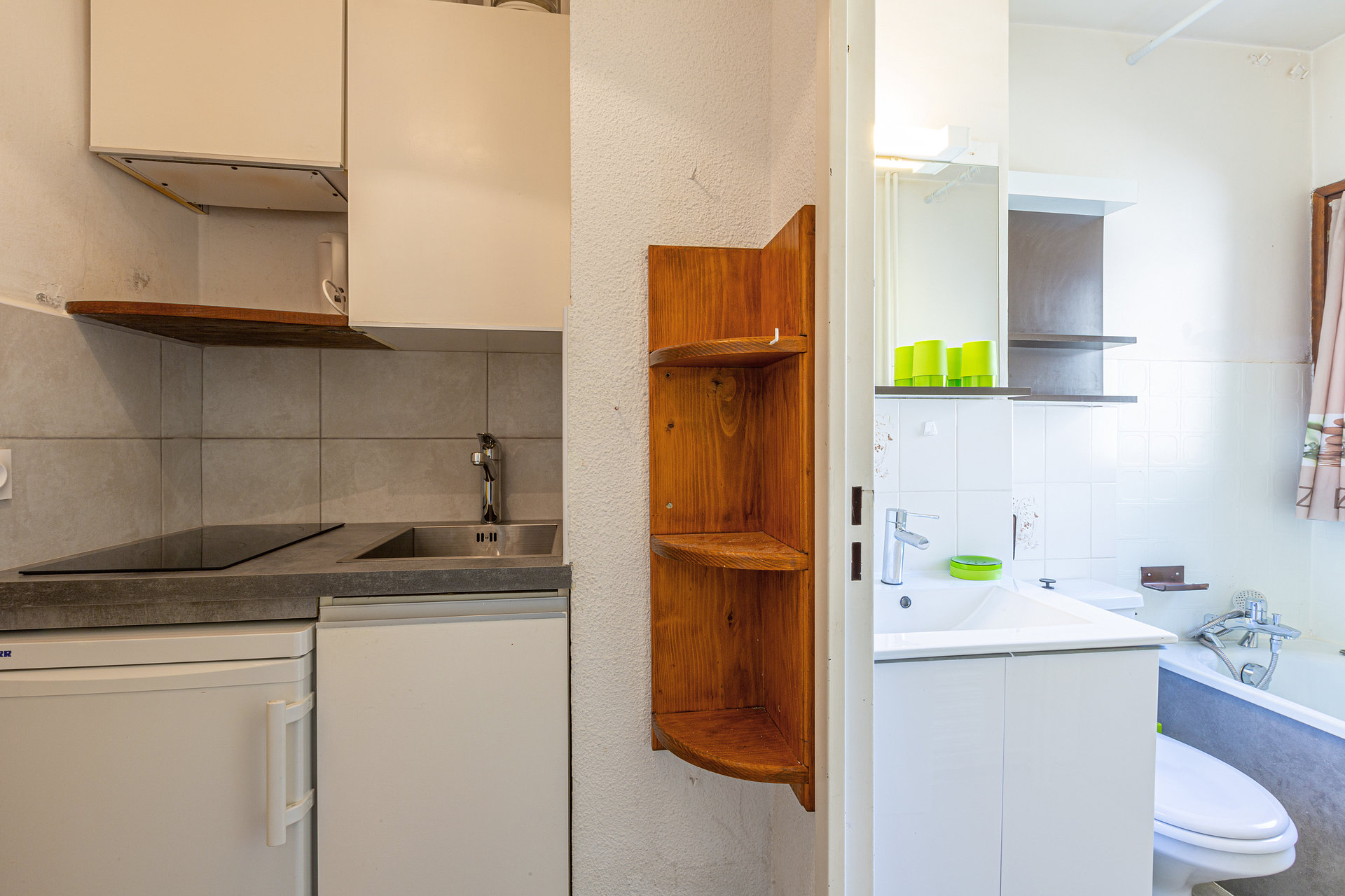 Equipped with a small oven, ceramic hob, hood, fridge, microwave oven