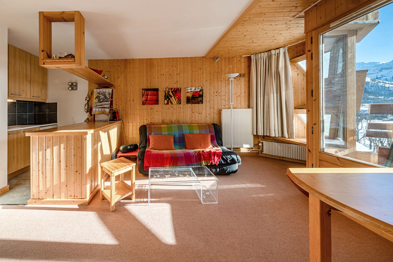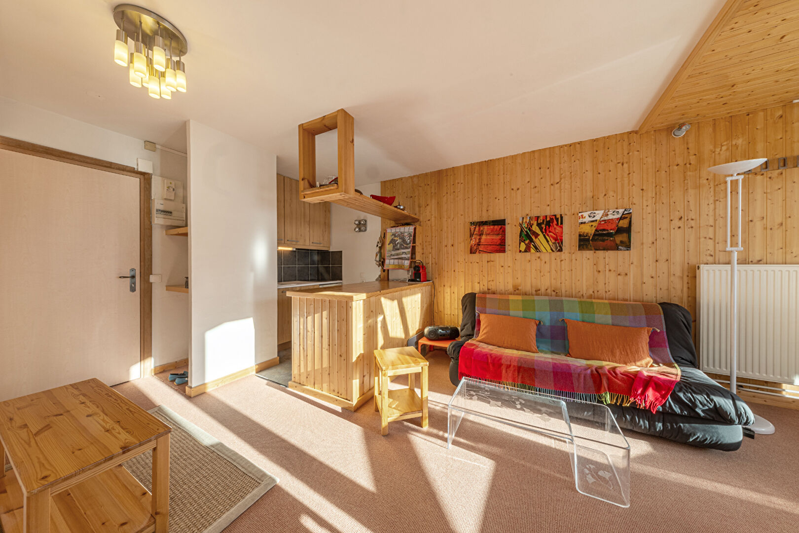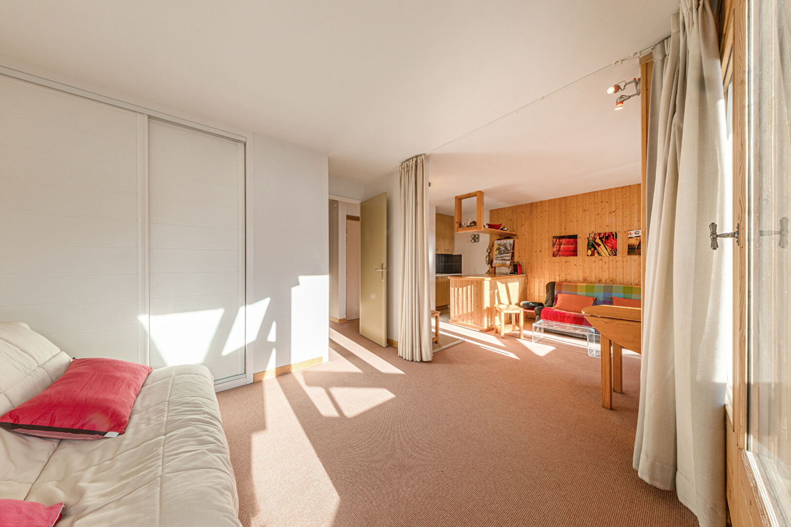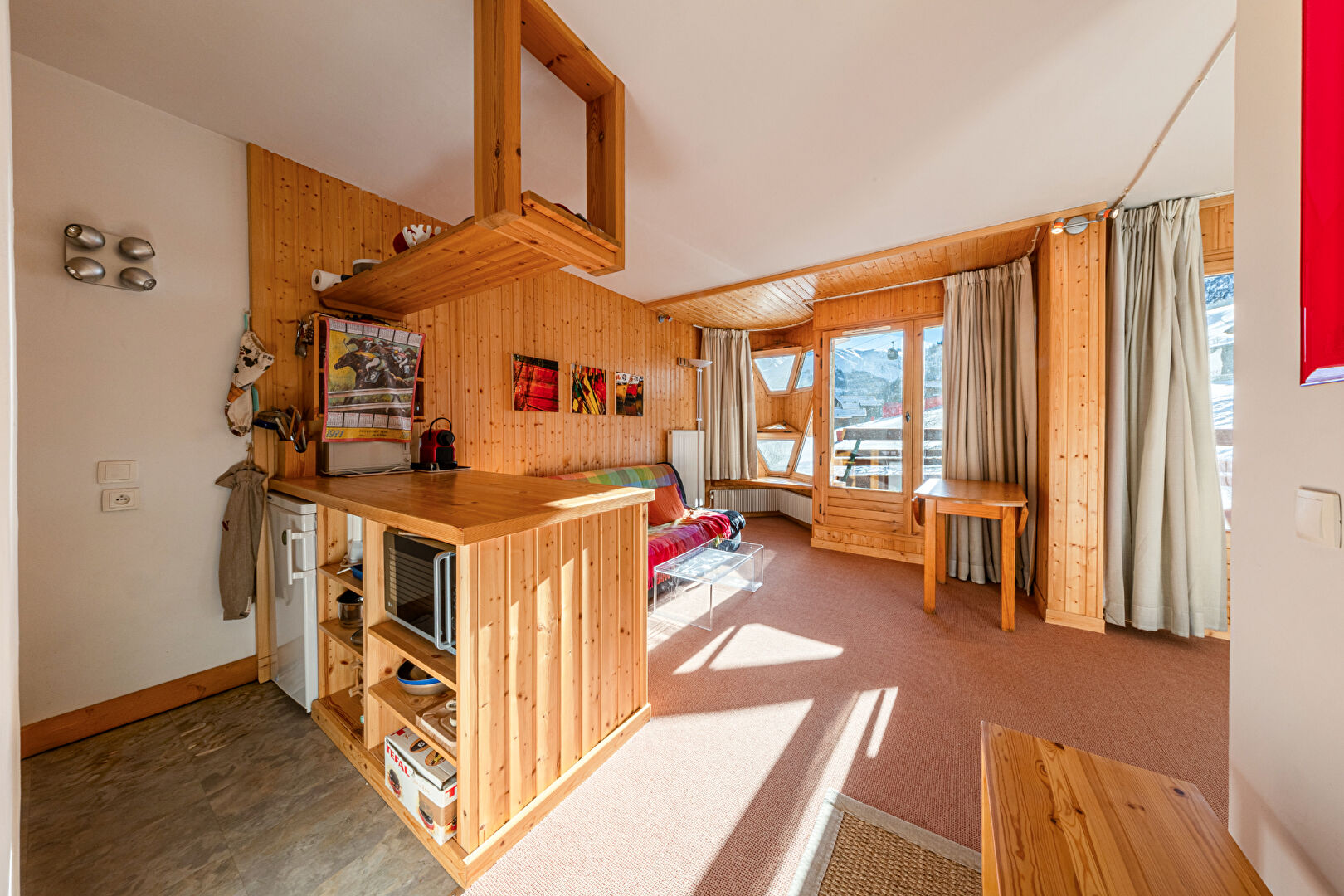 You will be charmed by this delightful and spacious one-bedroom apartment of approximately 37 sqm, ideally located in La Daille. Flooded with light thanks to its almost entirely glass façade, it offers a warm atmosphere and a captivating view of skiers descending the slopes. The flat comprises an open-plan kitchen with dining area, a flexible double living room with sleeping area, a separate WC and a bathroom. Perfectly comfortable for a couple, it can also accommodate a family of four, with the possibility of creating a cabin bedroom to optimise sleeping arrangements. Condominiums of 106 units (No proceedings in progress). Annual expenses : 3050 euros.
