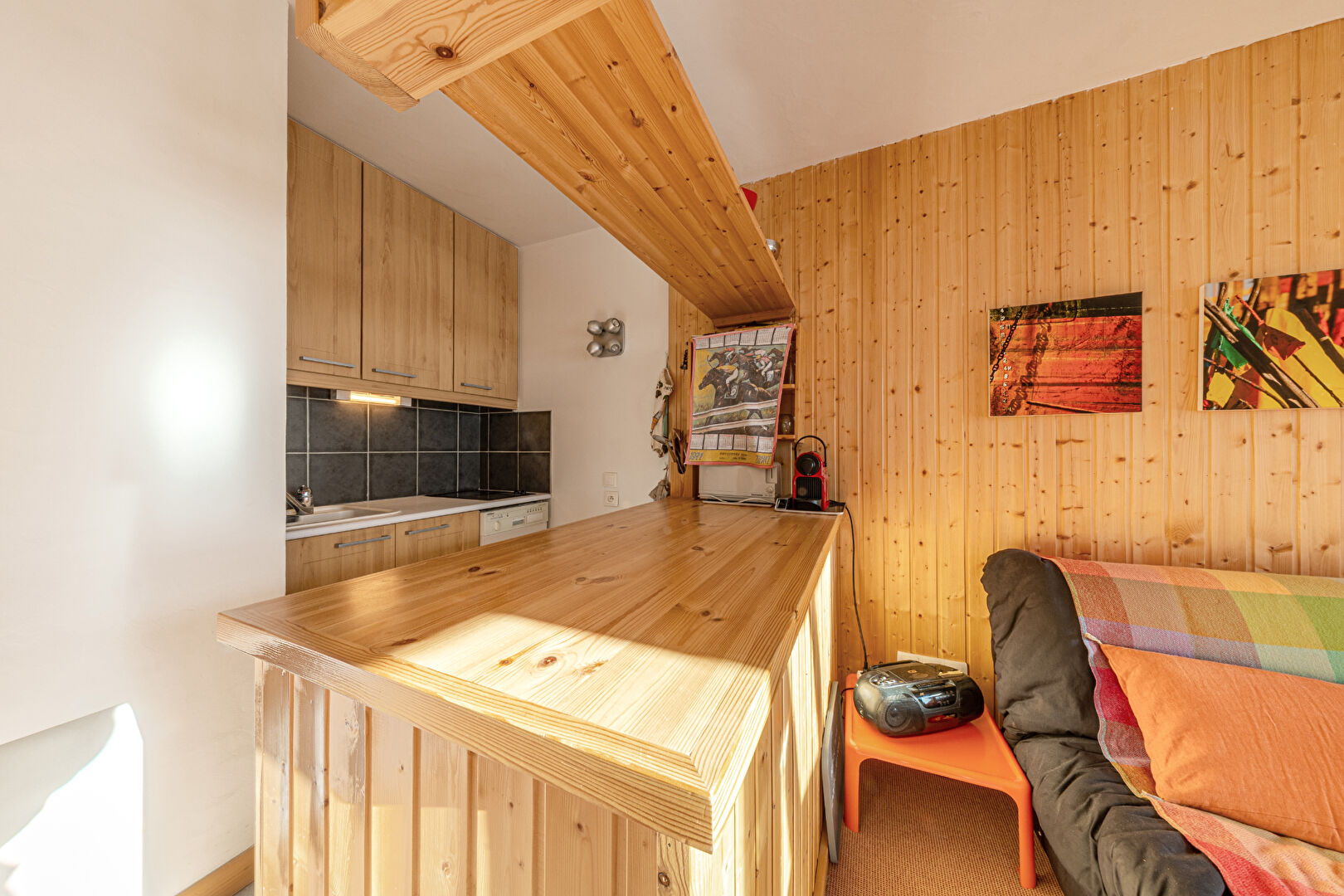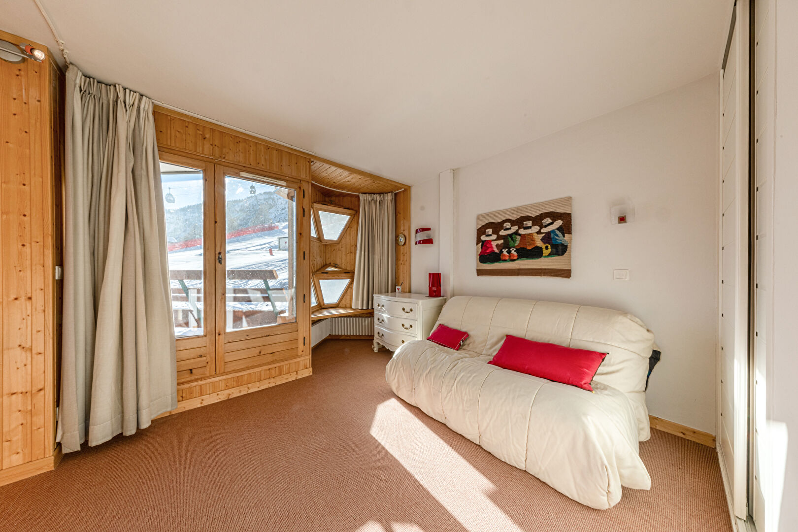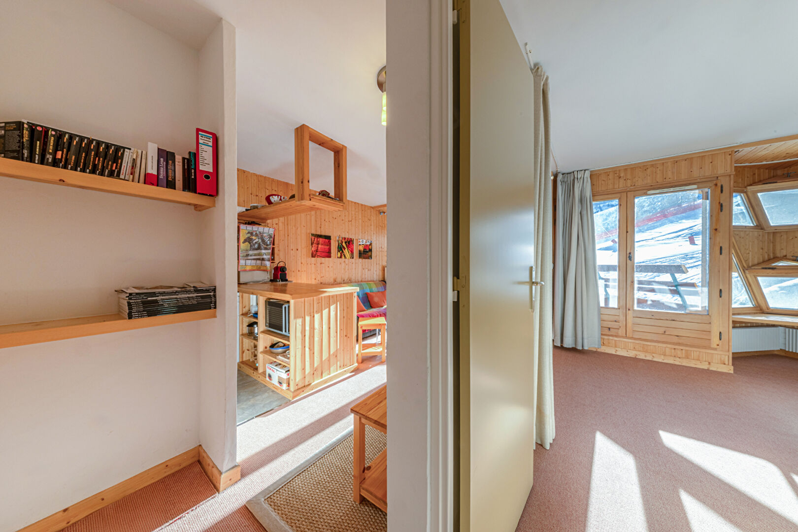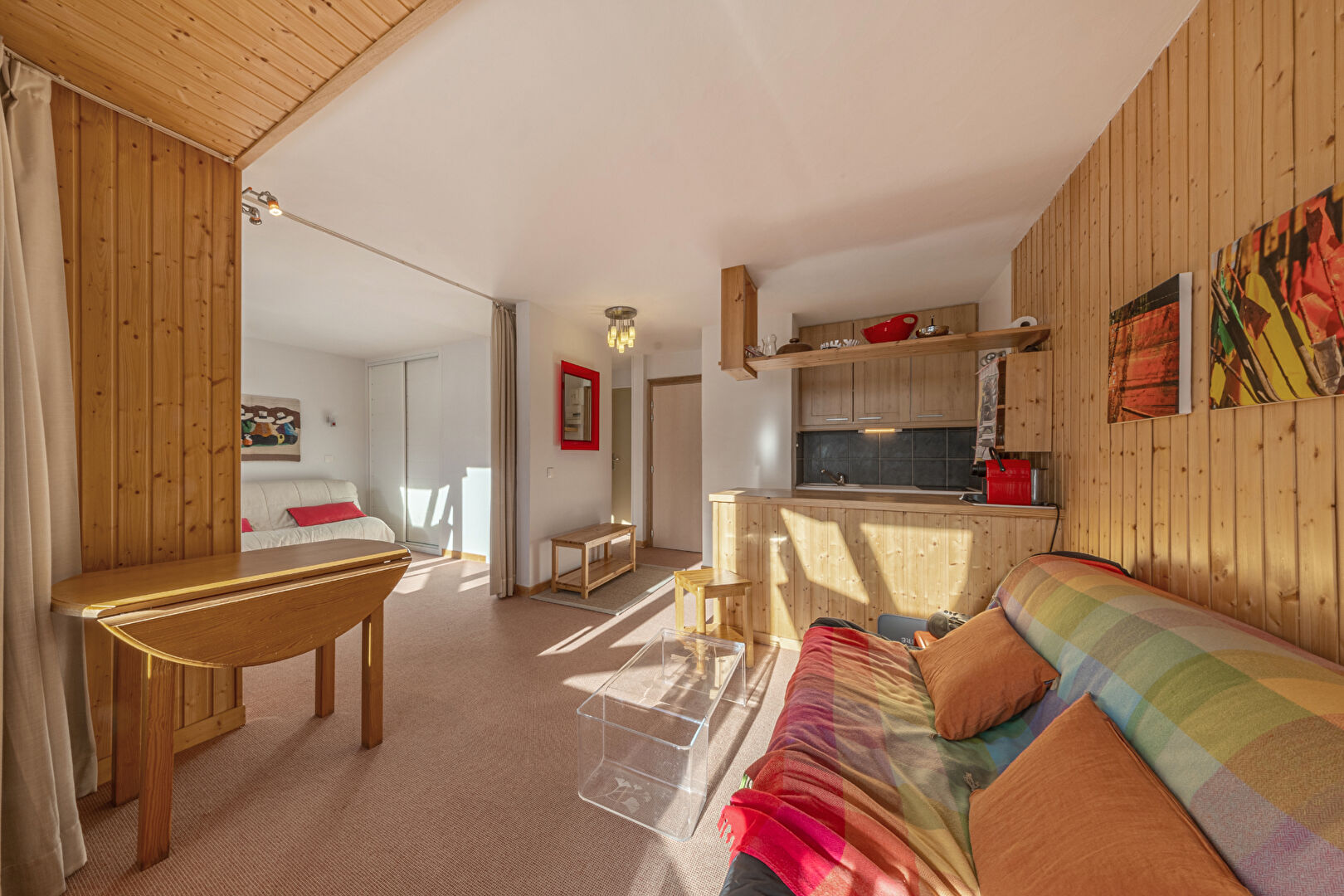 You will be charmed by this delightful and spacious one-bedroom apartment of approximately 37 sqm, ideally located in La Daille. Flooded with light thanks to its almost entirely glass façade, it offers a warm atmosphere and a captivating view of skiers descending the slopes. The flat comprises an open-plan kitchen with dining area, a flexible double living room with sleeping area, a separate WC and a bathroom. Perfectly comfortable for a couple, it can also accommodate a family of four, with the possibility of creating a cabin bedroom to optimise sleeping arrangements. Condominiums of 106 units (No proceedings in progress). Annual expenses : 3050 euros.