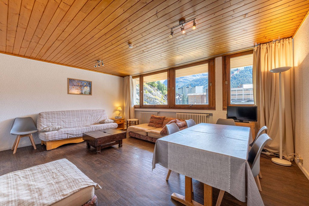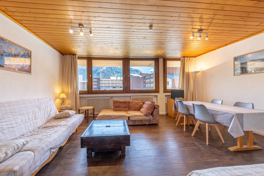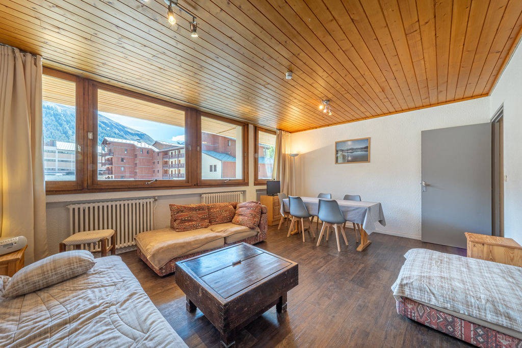 Less than a 10-minute walk from the heart of the resort and with a bus stop right outside the building, come and discover this spacious 1-bed apartment with a sleeping area. It comprises a beautiful bedroom, a bathroom, a separate toilet, a sleeping area with bunk beds and cupboards, a kitchen and a comfortable and bright living room. Thanks to its east-facing aspect and large bay windows, you can enjoy beautiful views of the SOLAISE mountain. This flat has great potential! It is sold furnished and comes with a ski locker. Condominiums of 222 units. Annual expenses : 5400 euros.