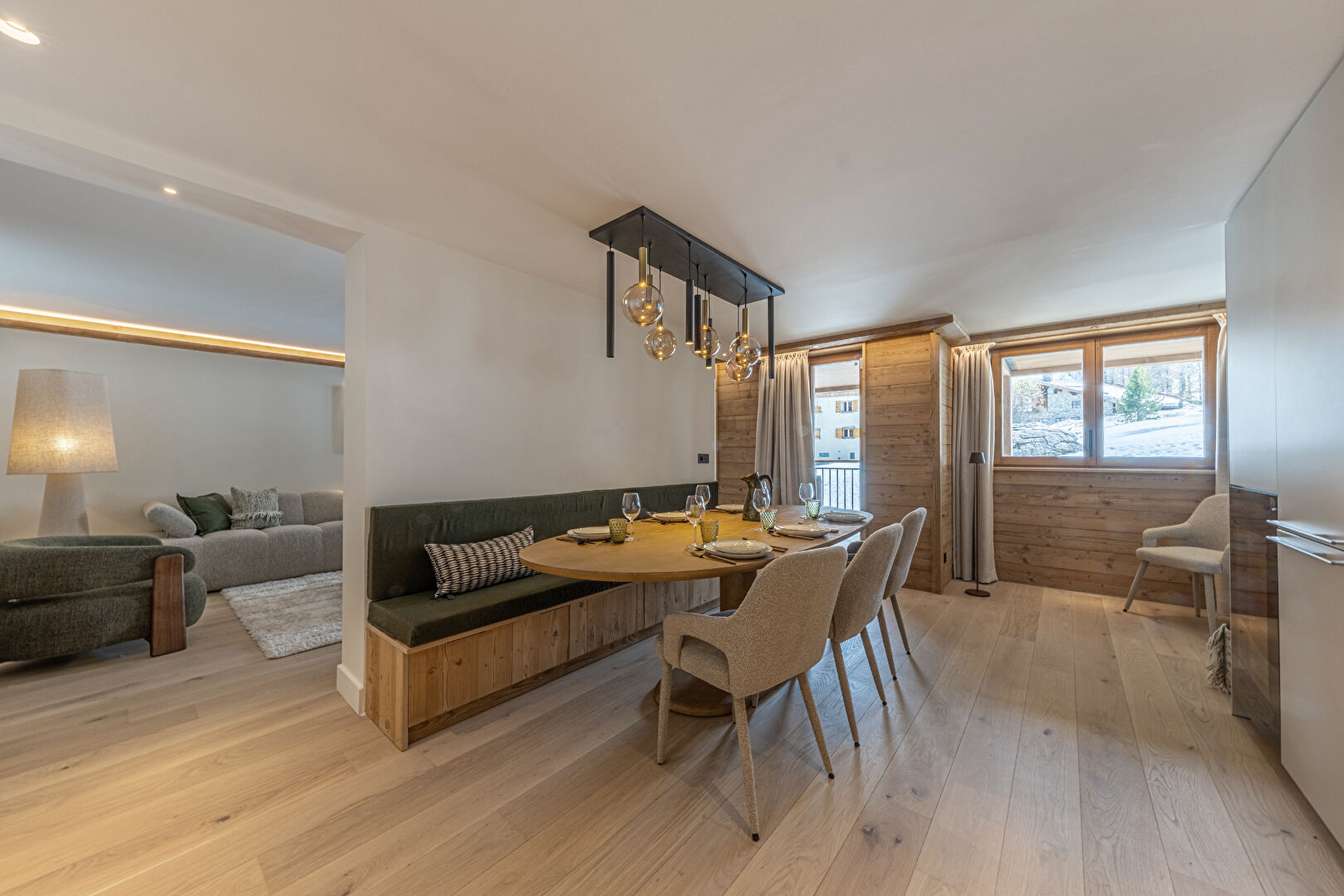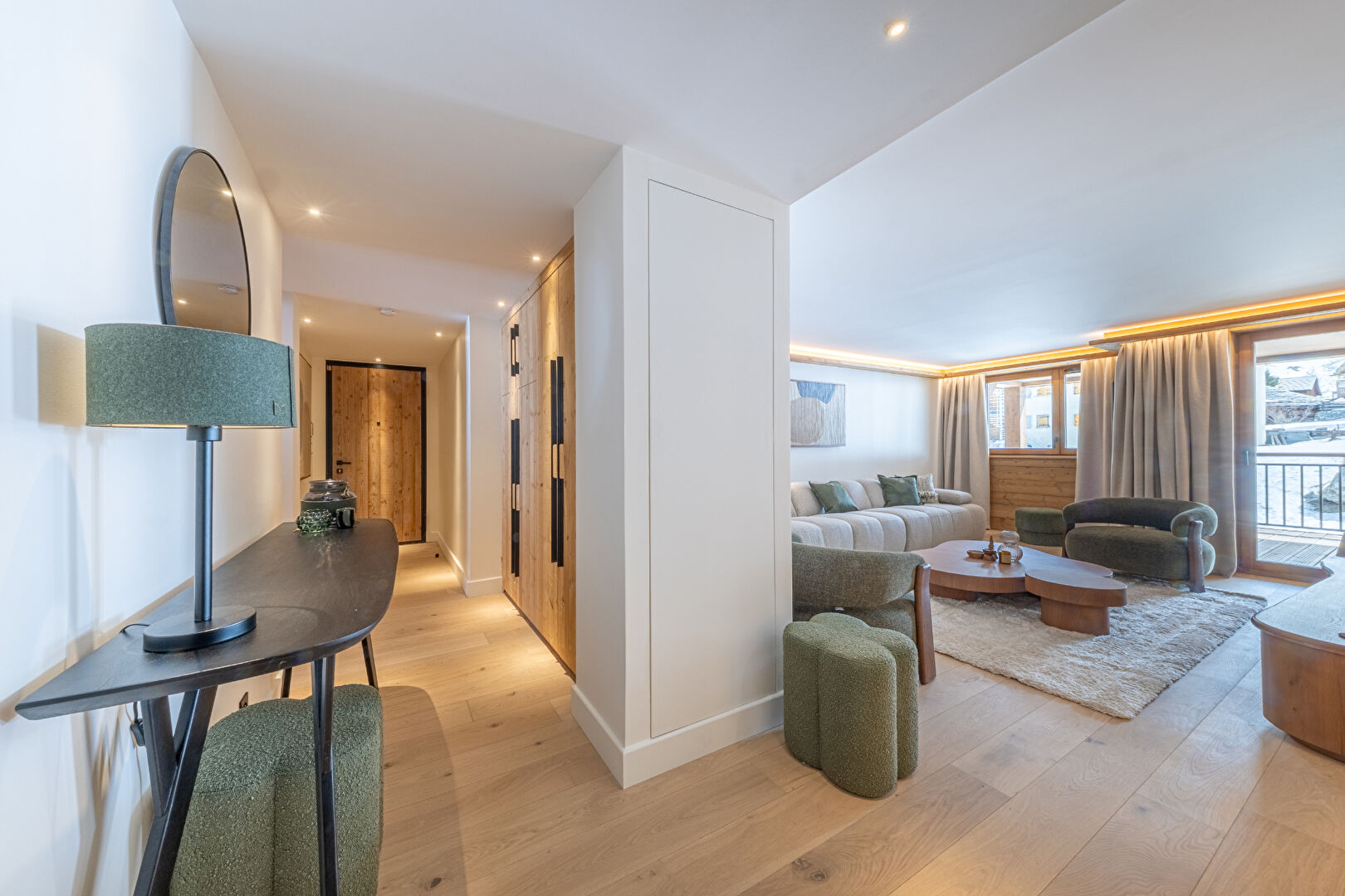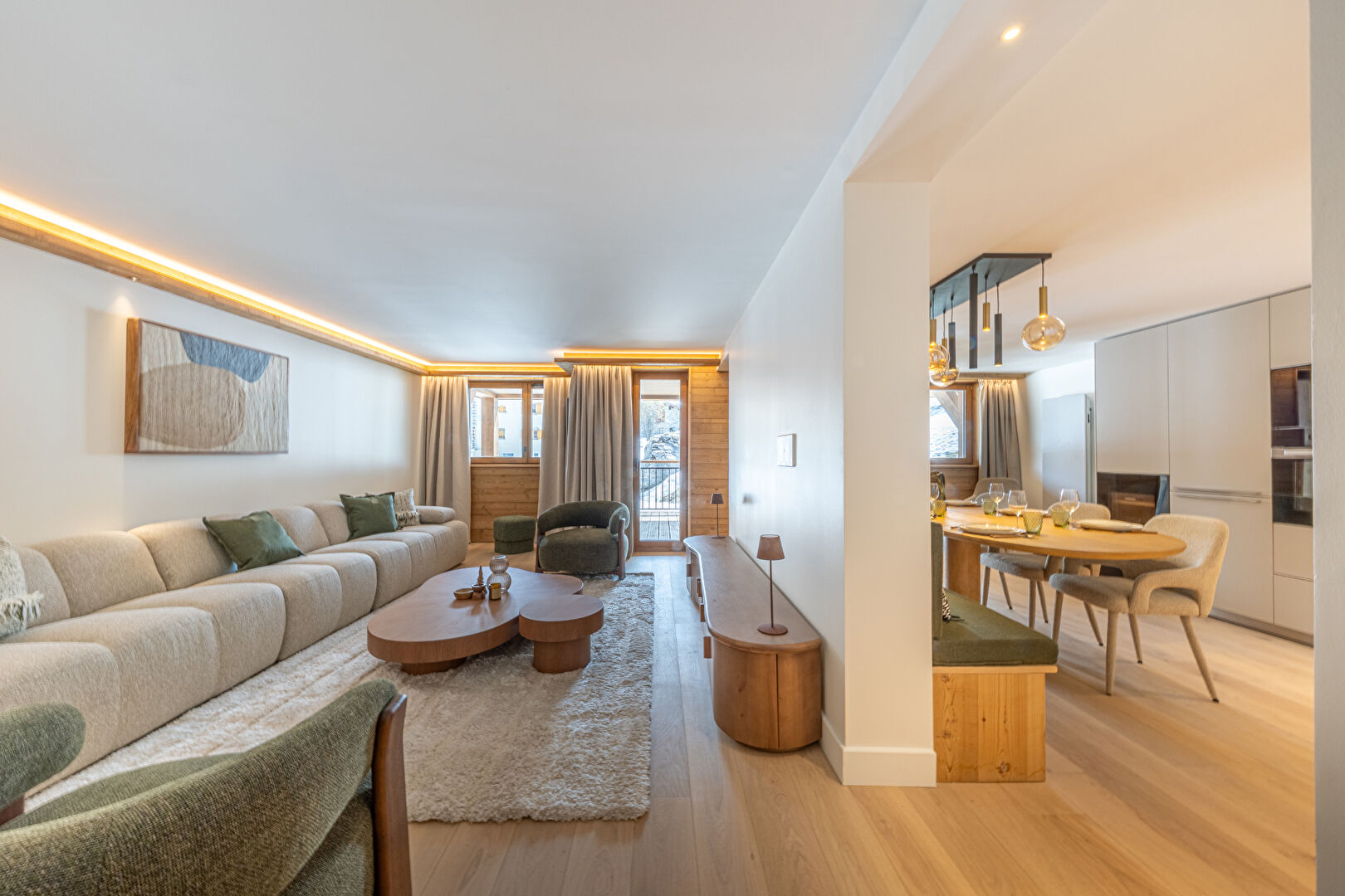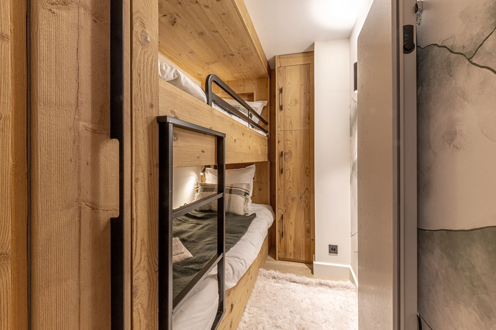 Come and discover this beautiful new 99 sqm flat in an intimate residence comprising 23 high-end flats, all designed and furnished in an Alpine style. This property is ready for immediate occupancy. It features a lovely living area with an open-plan kitchen and a large south-east-facing terrace. The sleeping area comprises a lovely en-suite double bedroom and a spacious family suite with a double bed and a children's sleeping area fitted with bunk beds. Contemporary décor with soft, rounded lines makes this a cosy retreat, ideal for spending time with loved ones in the heart of winter. Within the residence, you'll also enjoy the communal swimming pool, gym, sauna and steam room, offering a relaxing and exotic atmosphere. The apartment is sold with a ski locker with boot dryer, a storage cellar and two parking spaces. Condominiums of 23 units.