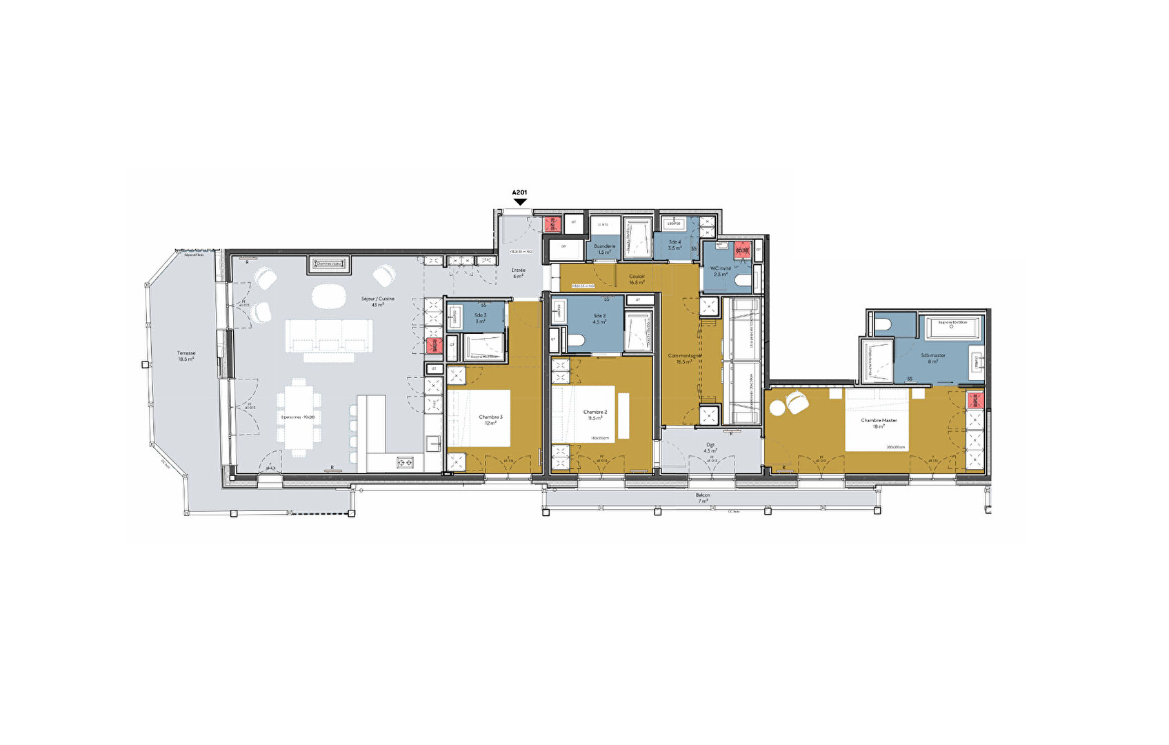 On the second floor of a new, intimate residence, discover this large flat designed to offer space, comfort and conviviality in an elegant setting. It features a beautiful, bright living room, ideal for entertaining and sharing moments with family or friends, opening onto a large south-facing terrace. On the night side, there is a master bedroom, two beautiful en-suite bedrooms and a large children's dormitory that will delight younger guests! A rare property combining generous volumes and high-quality amenities, in a new luxury residence, ideal as a second home or rental investment (VAT credit possible if rented out as a para-hotel). Delivery December 2027. Condominiums of 11 units.