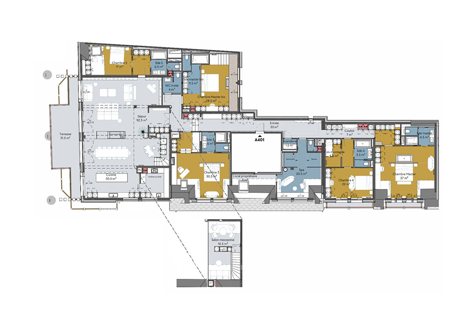 In a prestigious new and intimate residence, discover this 377sqm penthouse + 36sqm < 1.80 m. Located on the top floor of the building, it offers a vast cathedral-style living room of over 90sqm with two fireplaces and breathtaking views of the unique panorama of the Bellevarde massif and its legendary Olympic Face. Its six bedrooms (including two master bedrooms and one family bedroom) can accommodate up to 12 people in absolute comfort, one of which even has its own private fireplace! A wellness area with sauna and hammam awaits you after skiing. A unique place where you are sure to enjoy unforgettable moments with family or friends. Delivery December 2027. Condominiums of 11 units (No proceedings in progress).
